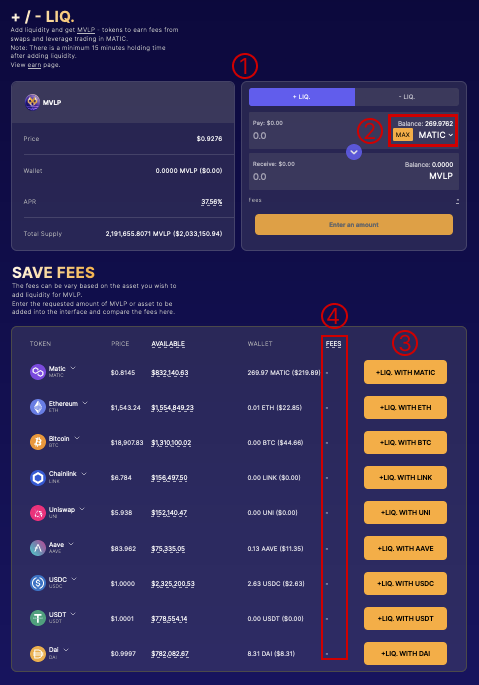 In box 1 you can choose to mint (“+ LIQ” button) or redeem (“- LIQ”) MVLP. You can choose any index asset to spend or redeem using either button 2 or any of the buttons in zone 3.