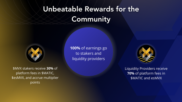 30% of swap and leverage trading fees are converted to $MATIC and distributed to the accounts staking MVX.