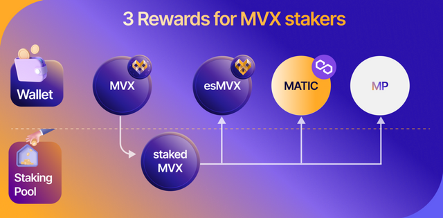 Staked MVX generates three reward types: