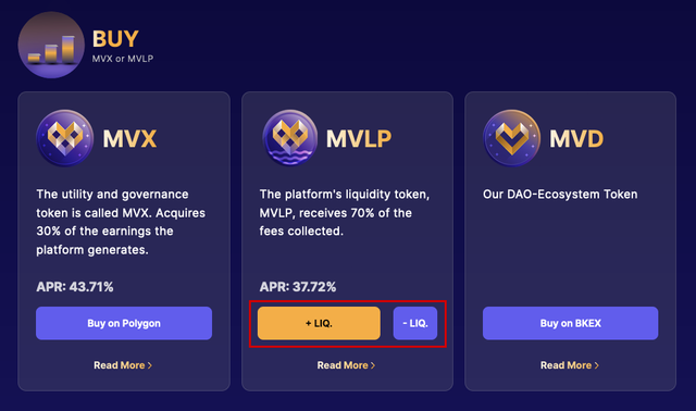 MVLP can be minted and redeemed by going on the “Buy” page from the header and clicking on the “+ LIQ.”, “- LIQ” buttons in the MVLP box.