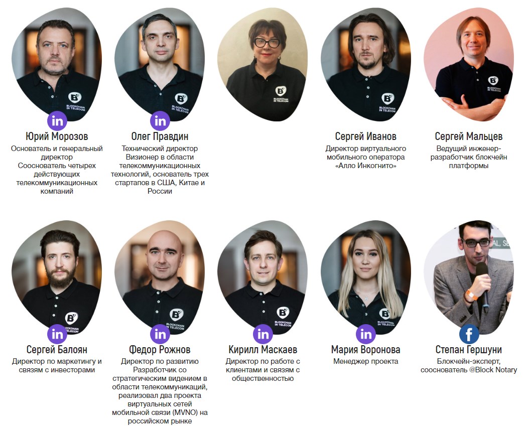 Проект масштабный, поэтому и команда, которая над ним работает, большая. Для решения такой непростой задачи привлечено множество экспертов и специалистов с многолетним опытом работы в областях блокчейн, телекоммуникационных технологий, IT и других. Так же приятно, что команда многонациональная. Это значит, что очень многие люди с разным виденьем и подходами к работе смогут создать действительно полезный продукт, отвечающий требованием большинства пользователей. Главные лица компании таковы: