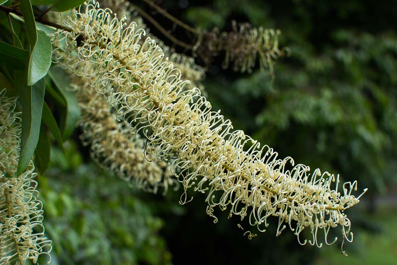 Ivory curls can grow up to 7 meters in height, although different climates may reduce its growth, causing it to reach shorter heights. It takes about 3 to 5 years to reach maturity for flowering. The tree has a skinny grey trunk, with the branches forming a rounded shape at the top. The leaves are longish and dark green, with tips that can vary in colour throughout the year from silver to red. But the crowning glory of this tree is its magnificent, profuse ivory/pale yellow cylindrical flowers. These are so plentiful in number and clustering that they can appear to beautifully overwhelm the tree. Bees 🐝, honey eaters and insectivorous birds are attracted to this tree.