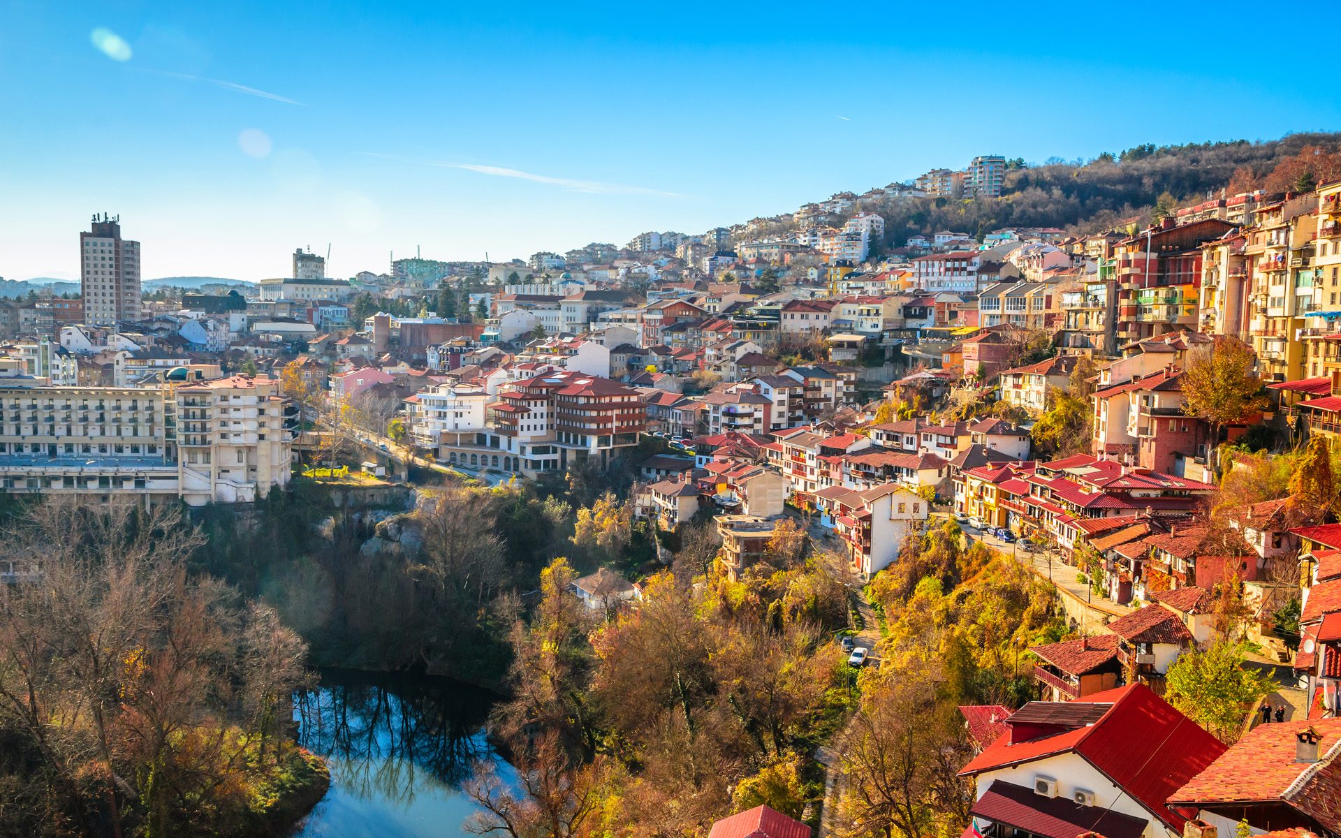 Veliko Tarnovo is a city located in the centre of Bulgaria, on the halfway between Sofia and Varna. South of the town rise the cold northern slopes of the Balkan Mountains and north of the city extends the vast Danube Plain.