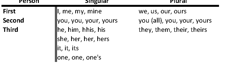 Let's take a moment to review the English pronouns, since many readers probably don't remember their grade school classes, though we use them all the time without thinking about it.