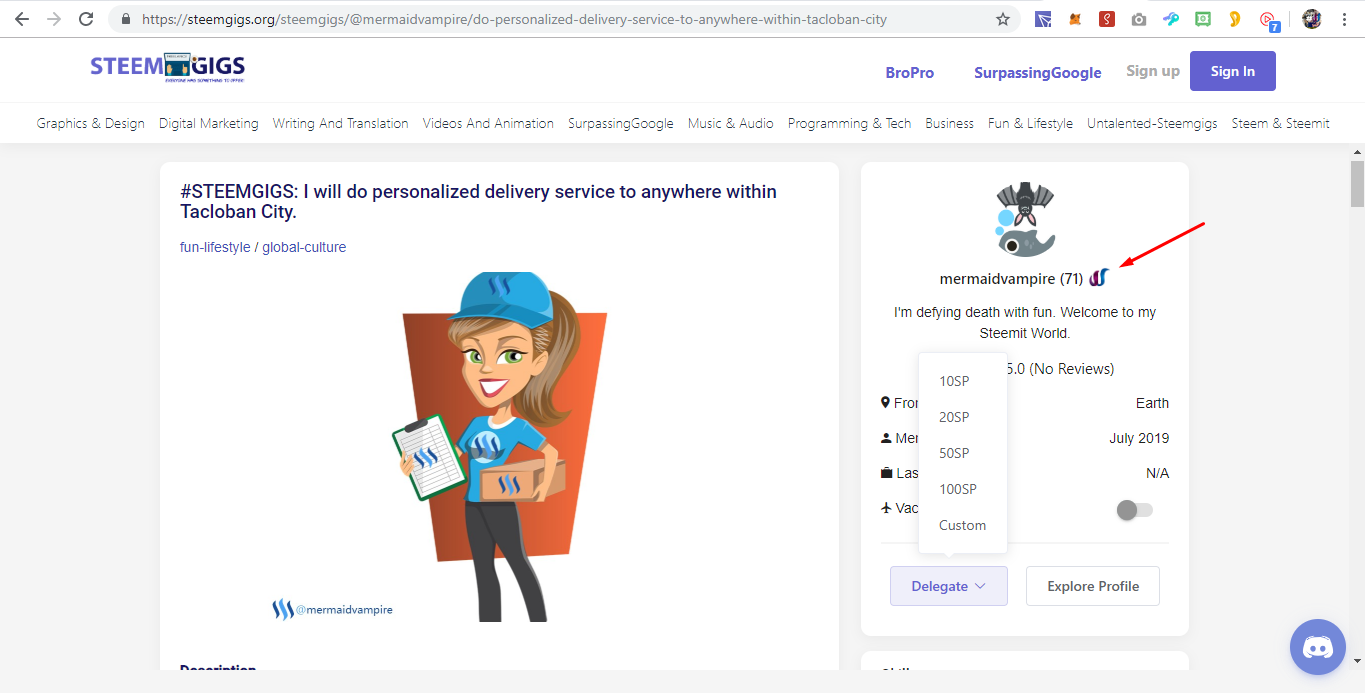 Since @ericet hasn't offered a gig on steemgigs.org just yet, let's look at the profile of @mermaidvampire who has offered a gig: