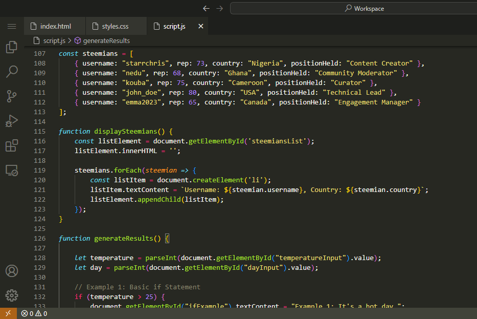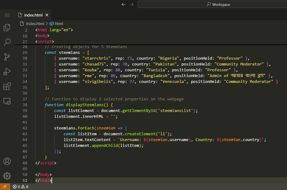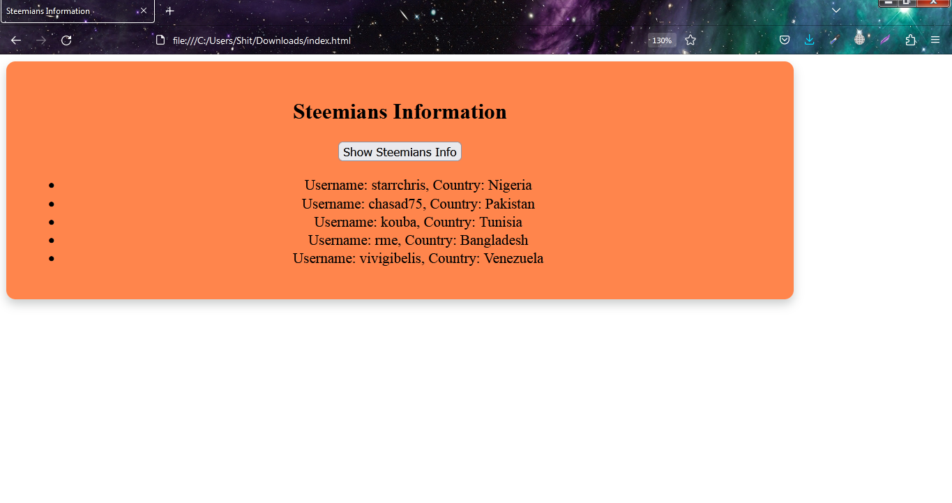 Here I created objects for 5 Steemians and then use display function for 2 properties username and country as it is said in the assignment. I will add this to the final layout as well.
