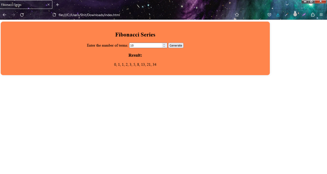 For Fibonacci series I created an input field where a user will input number up to where he wants this series to show result. Actually Fibonacci series is an infinite series which starts from 0 and 1. In this series, every next number is the sum of previous two numbers. You will better understand it with example below. I will share all in a video as well in the end.