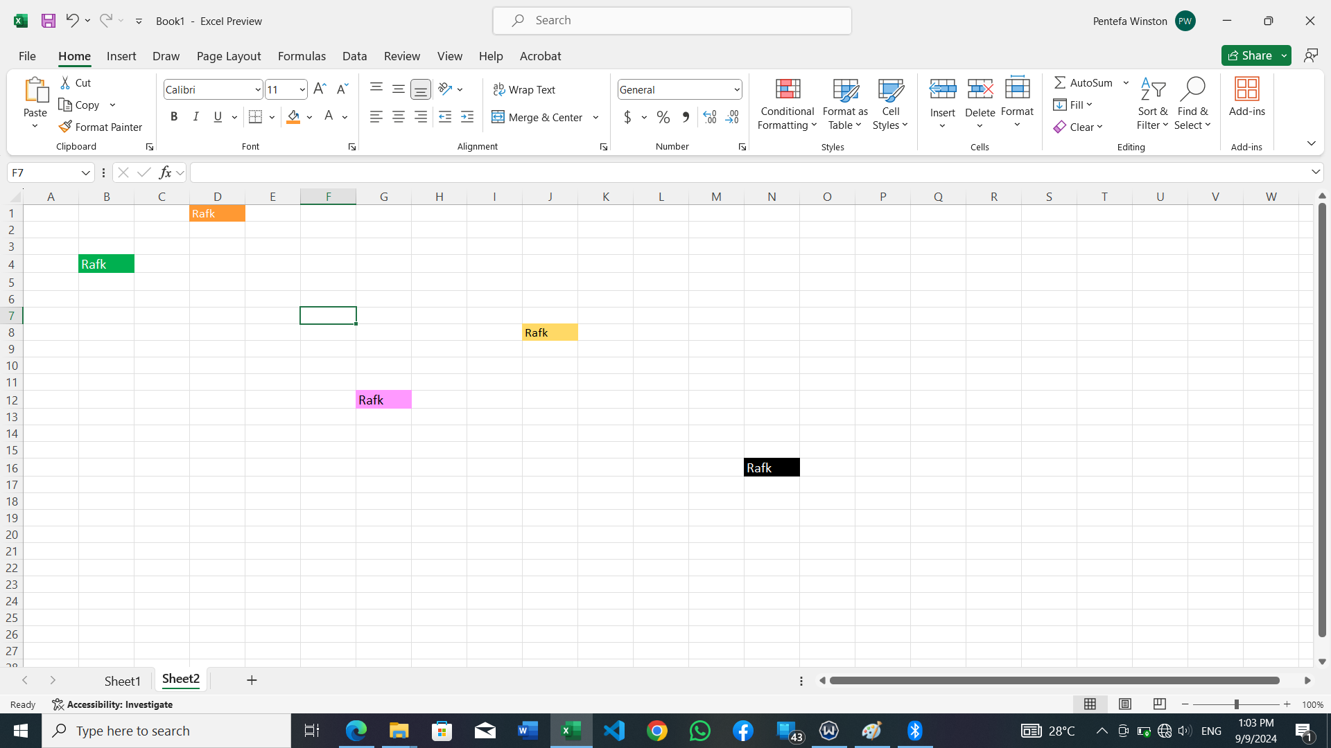 | Take a screenshot my worksheet and identify the cell Addresses of the following; N16 with a fill color of black, J8 with a fill color of yellow B5 with a fill color of Green G12 with a color fill of purple and D1 with a color fill of orange. Write my username on these cells using a visible font. |