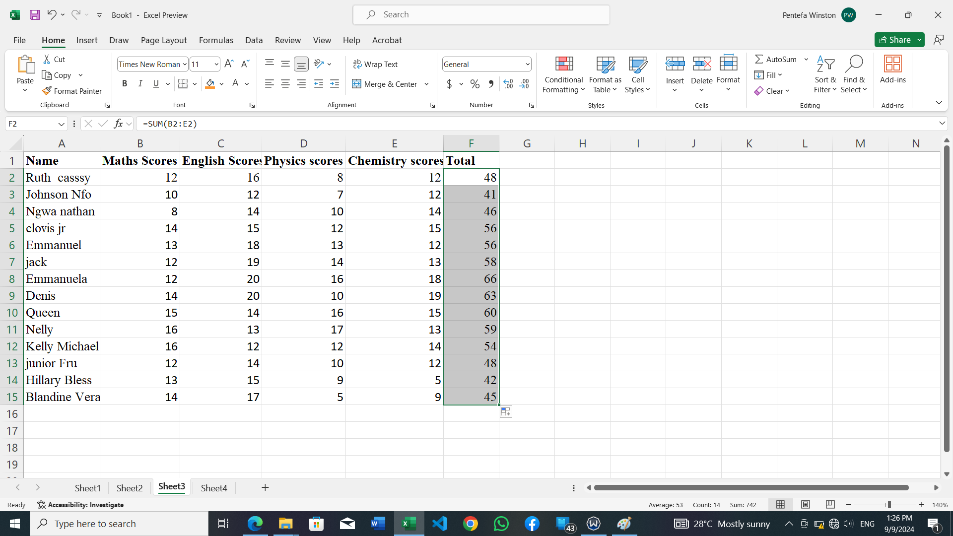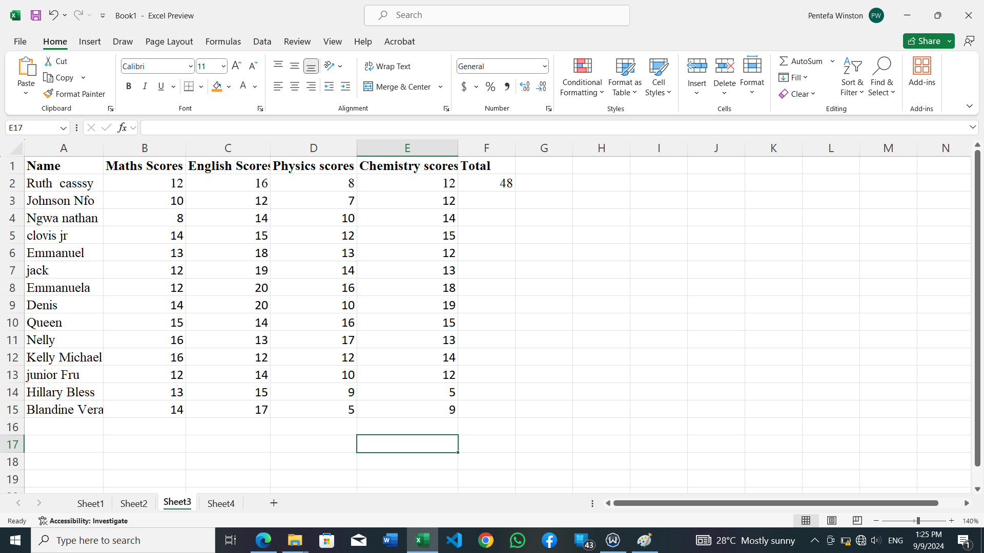 | Prepare a score for 15 students where the cell A1 label will be Name, cell B1 label will be Maths Score, cell C1 label will be English Score, cell D1 label will be Physics Score, cell E1 label will be Chemistry Score and cell F1 will be labeled Total. Fill in all necessary information and calculate the total for each student's score . Demonstrate clear working. |