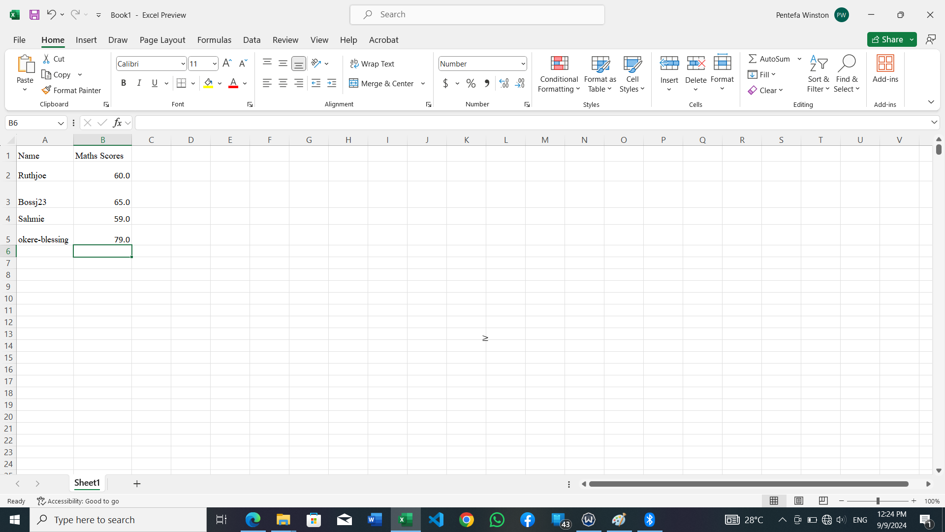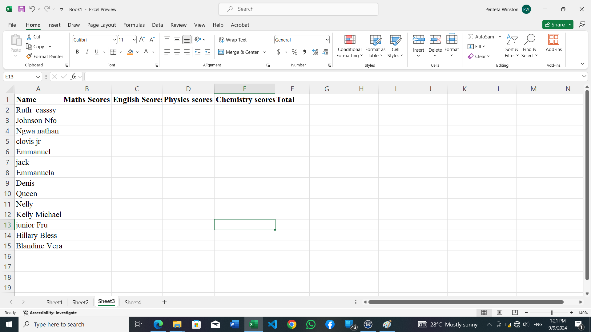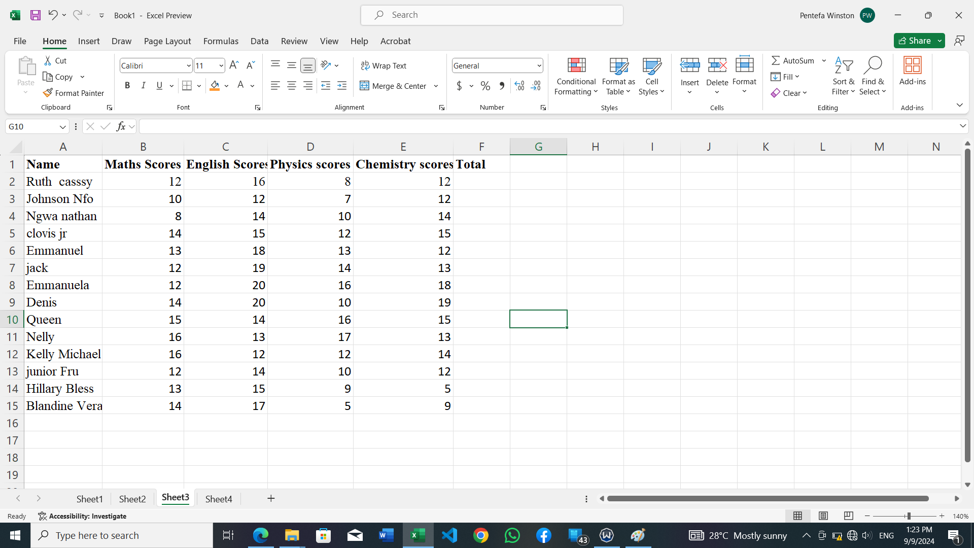 I began by feeling in the necessary work in my spreadsheet as instructed. Starting with the name and subjects.
