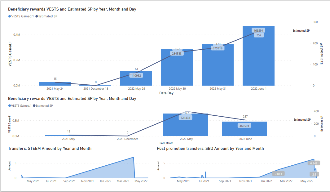 In case anyone is wondering, here are the numbers midway through our first week of payouts, as reported by steemdb.io and visualized in PowerBI. Daily and monthly beneficiary rewards, followed by STEEM and SBD transfers.
