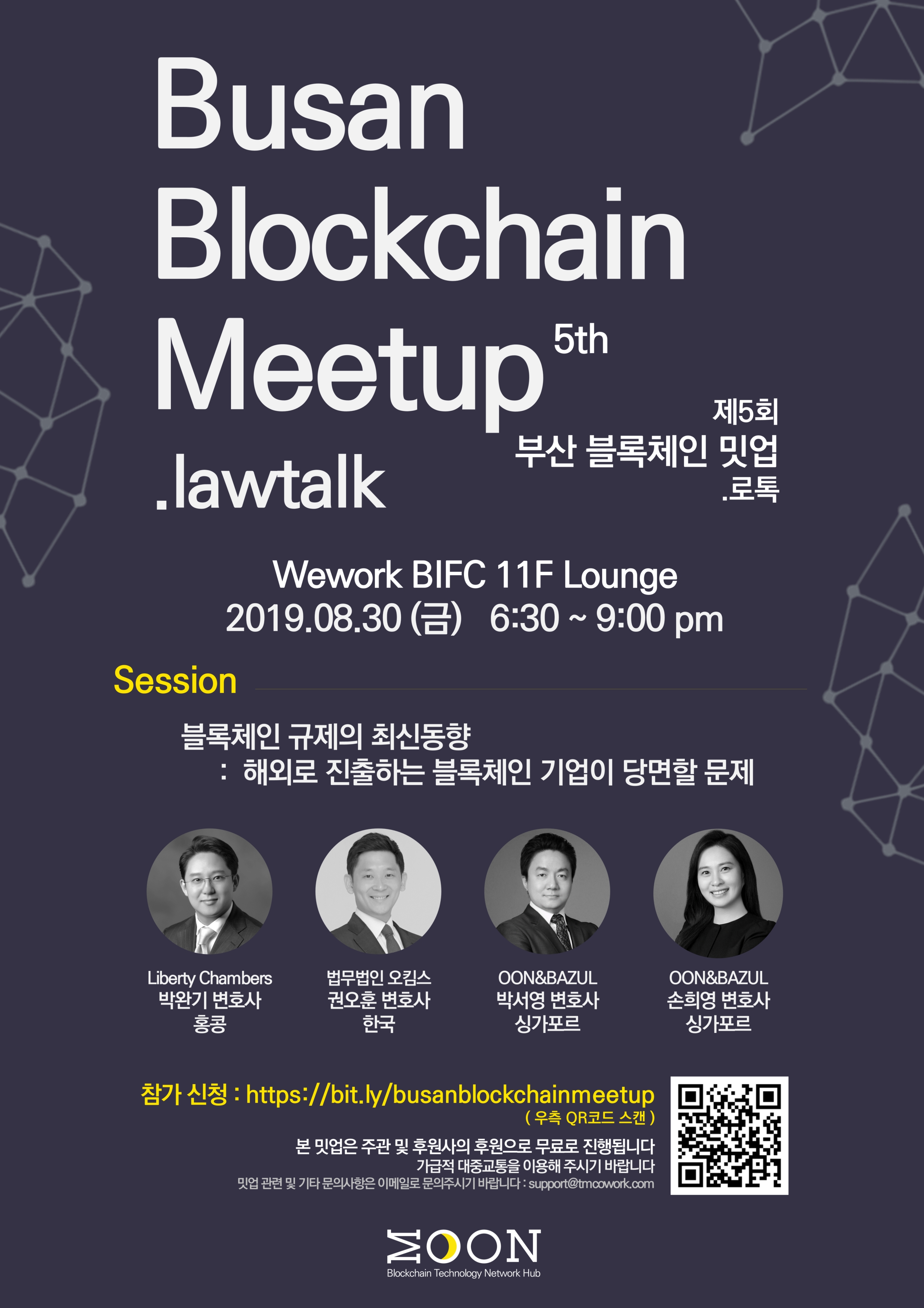 이번 밋업의 주제는 'Busan Blockchain Meetup . lawtalk'입니다. 싱가포르, 홍콩등 다양한 국가에서 활동하시는 법률전문가분들과 함께 블록체인과 규제에 대하여, 해외에 진출하는 기업들이 당면하는 규제 이슈에 대한 부분을 이야기 나눌 예정입니다.