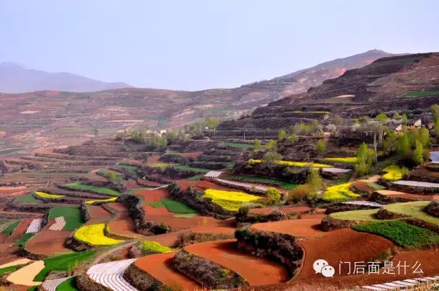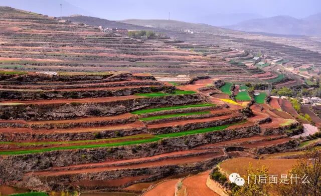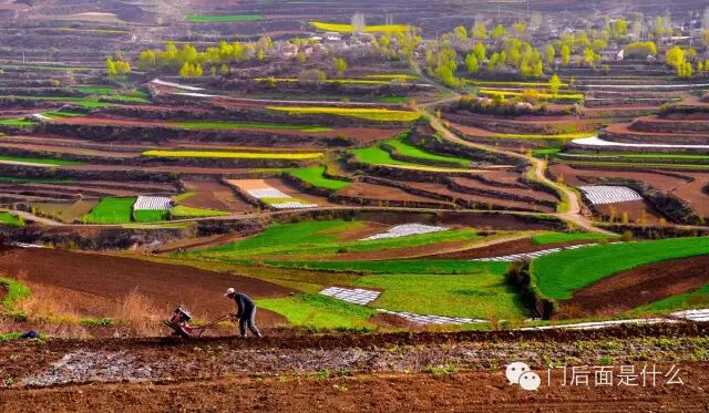 陇西县位于黄土高原与秦岭丘陵地带之间。五月,正是春耕时节。 爬上一个山坡,大片的梯田突然出现我眼前,黄色的油菜花、绿色的麦苗和还没来得及播种的红色土地交织在一起,却又因为色彩显得层次分明。