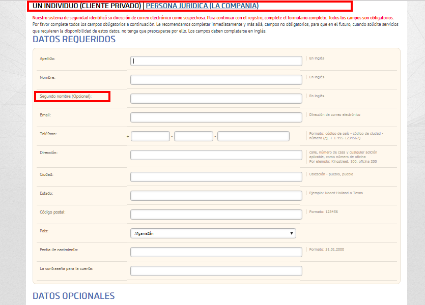 Completar el siguiente formulario, el segundo nombre el opcional. Si usted tiene la intención de crear una cuenta personal, presione : UN INDIVIDUO (CLIENTE PRIVADO) o si representa una empresa :PERSONA JURÍDICA (LA COMPAÑÍA)