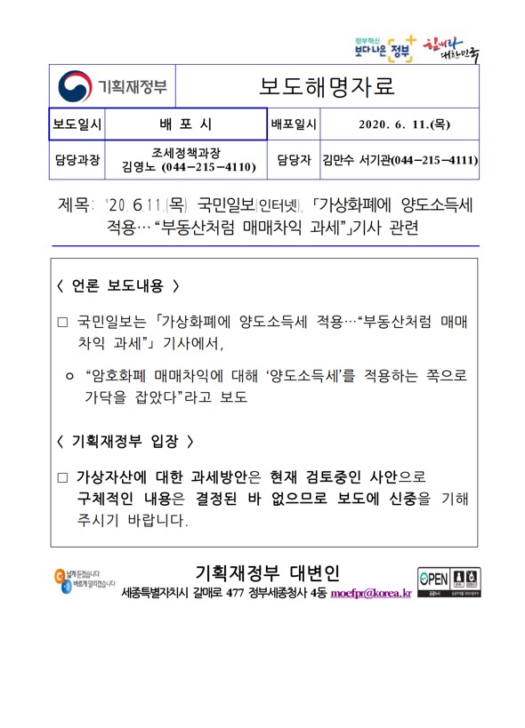 가상화폐 양도소득세적용에 대한 기재부의 해명자료