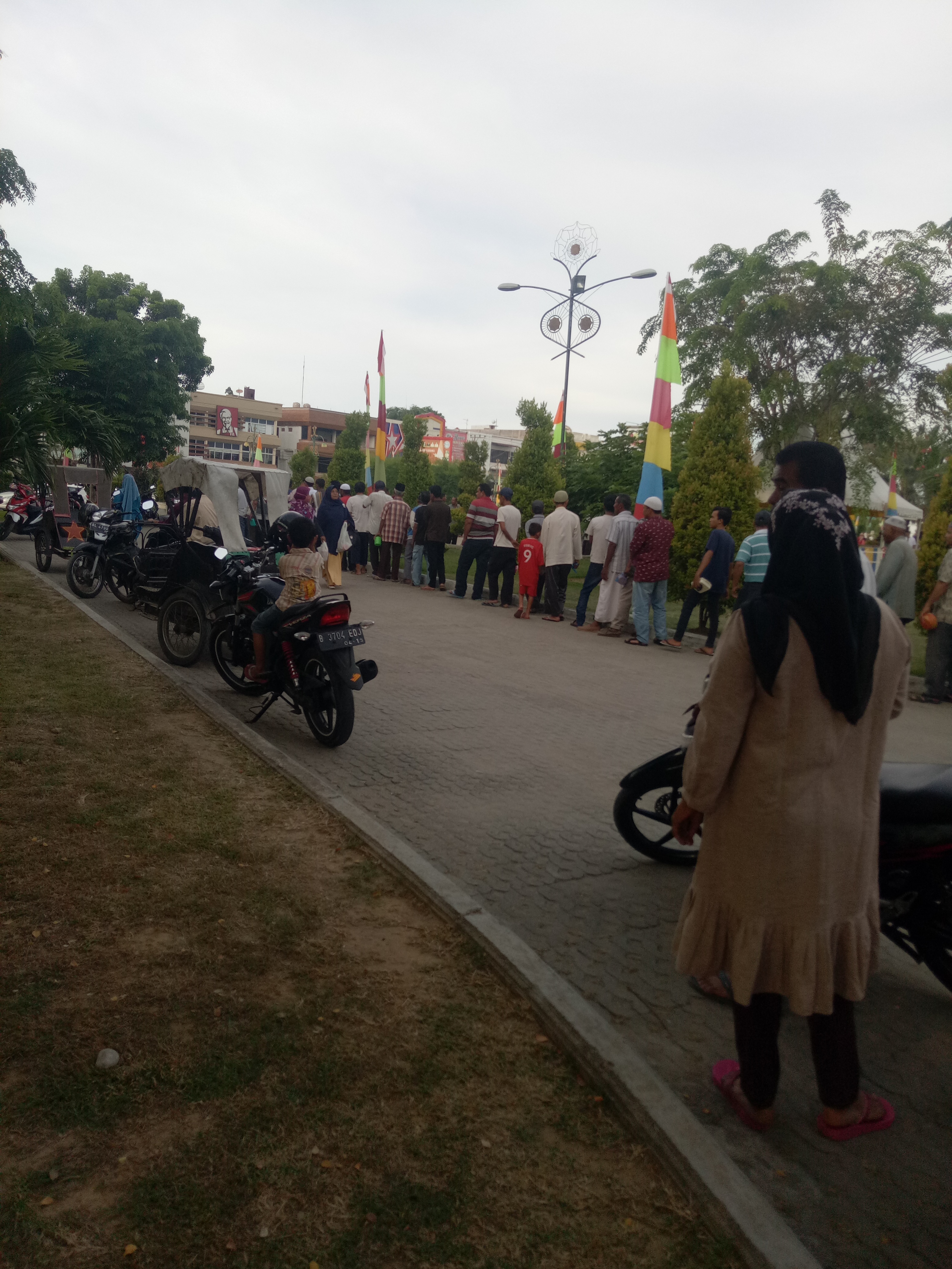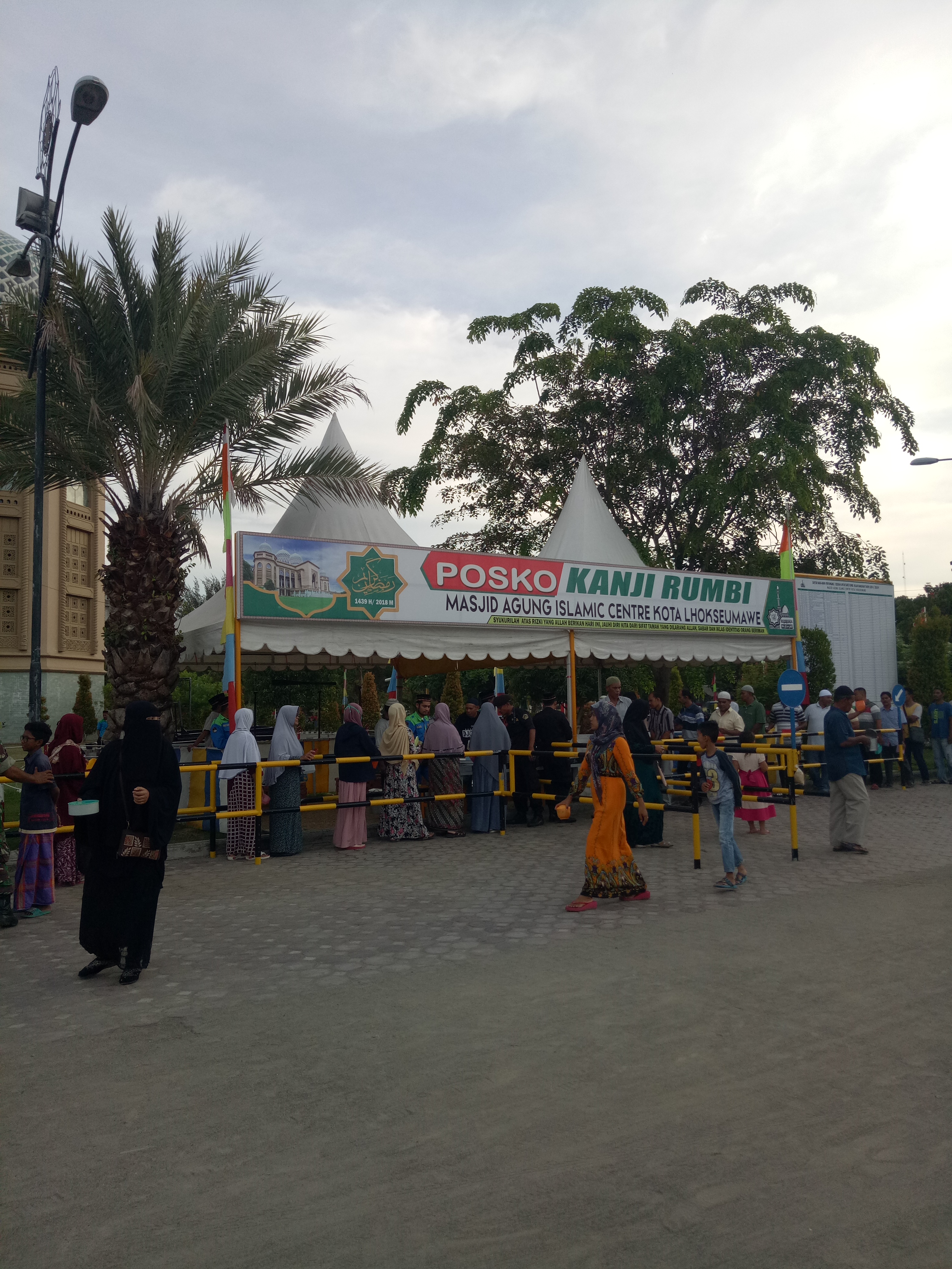 Pemandangan seperti ini bisa kita lihat setiap sore pada Bulan Ramadhan yaitu antrian panjang untuk mengambil pembagian kanji rumbi yaitu makanan khas pada Bulan puasa. Kanji rumbi ini sengaja dibagiakan oleh pengurus islamic center kepada semua warga, khususnya warga seputaran Lhokseumawe. Nah bagi warga yang ingin menikmati kanji rumbi ini monggo antri dulu dengan tertib.