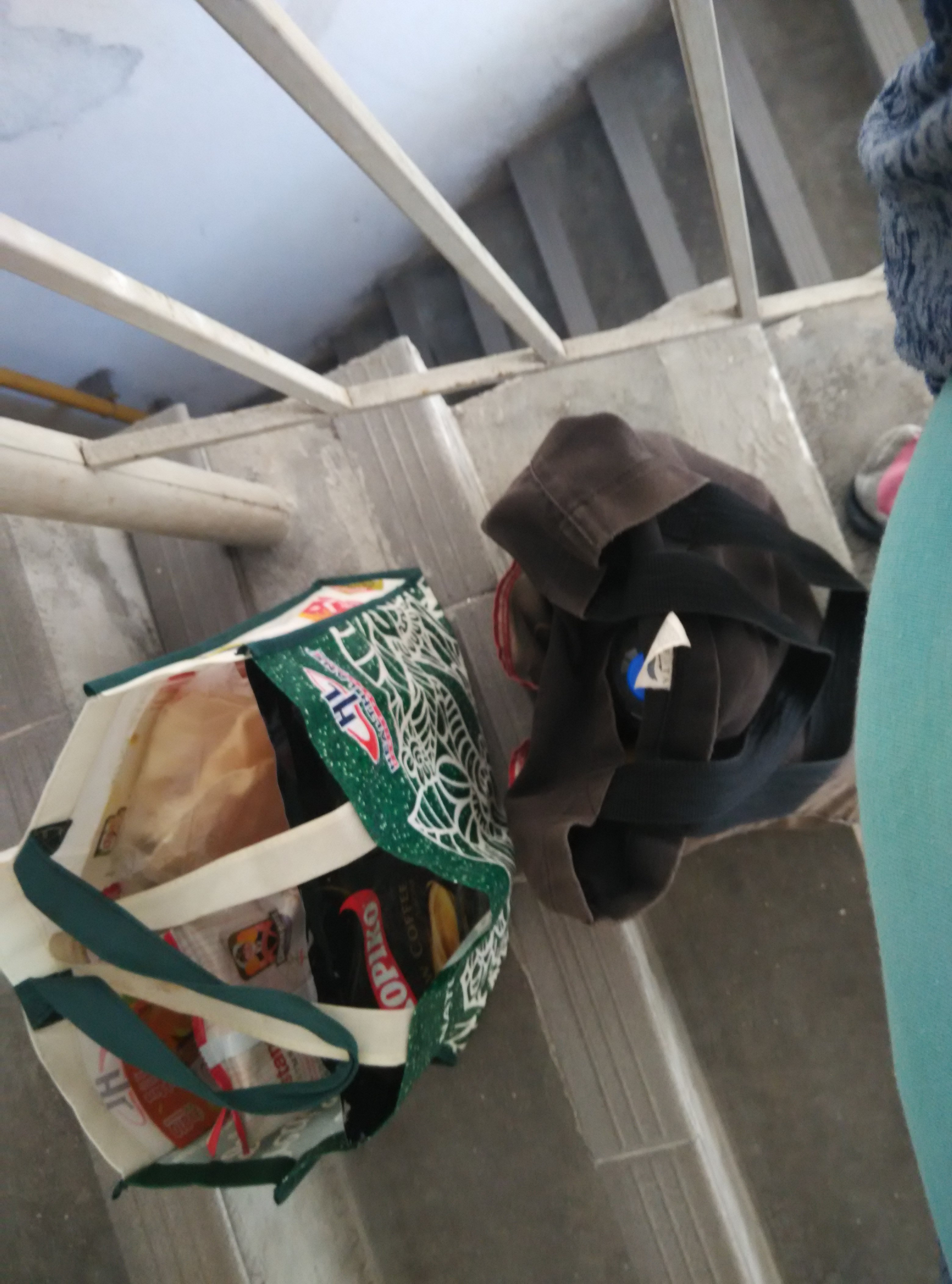 Normally I have these two bags on my shoulders, but now I have a new tactic. When I get to the stairwell of my condo, I put the bags on the steps and lift them one-by-one up the stairs. By the time I have gotten this far it's easier than keeping them on my shoulders. This takes twice as long, but at least I am not in danger of falling back down the stairs as I climb.