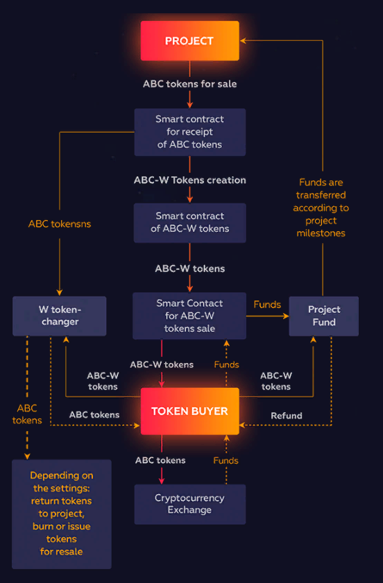 - Обменять токен ABC-W на часть неизрасходованных проектом средств. Правила обмена зависят от типа ДАО используемой проектом.