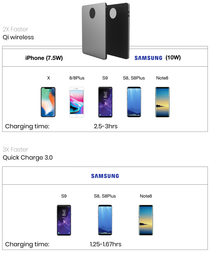 장치를 최대 10w까지 빠르게 충전 할 수있는 유일한 전원 공급 장치입니다. iPhone X 용 7.5w 출력, 8 및 8 플러스 출력, 안드로이드 폰 용 최대 10w 출력 유선 충전의 경우 PowerDock은 QC 3.0 (Qualcomm 빠른 충전) USB-A를 지원하여 기존 충전기보다 빨리 Android 4x를 충전 할 수있어 장치 배터리를 35 분 내에 80 %까지 가져옵니다.