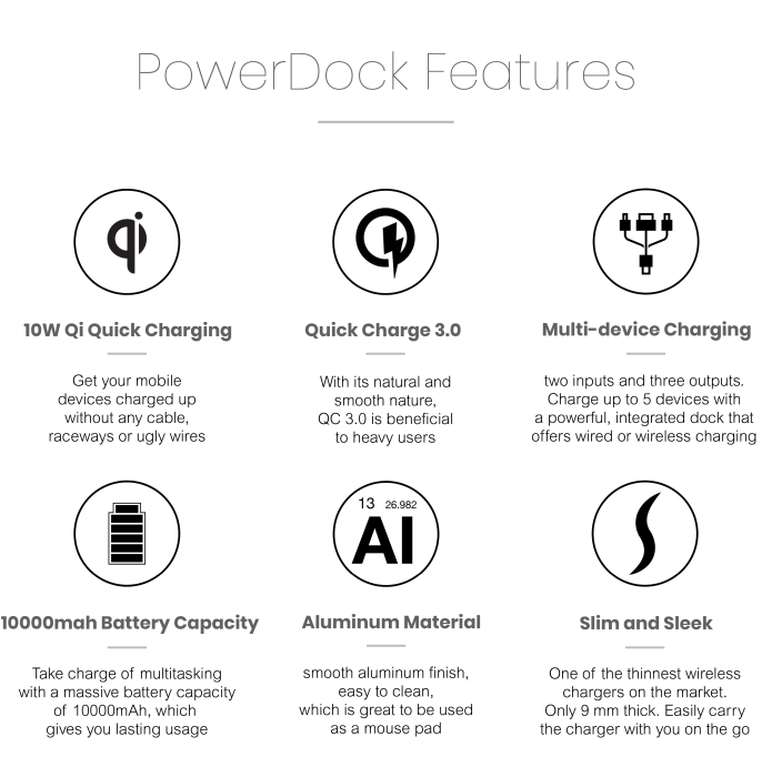 강력한 무선 모바일 급속 충전소 + 파워 뱅크 (powerbank)가있는 유선 충전 도크로 더욱 효율적이고 청결한 작업 환경을 조성합니다. PowerDock은 독창적으로 설계되었으며 손쉽게 작동하며 배터리 수명과 지저분한 케이블에 대해 걱정할 필요가 없습니다.