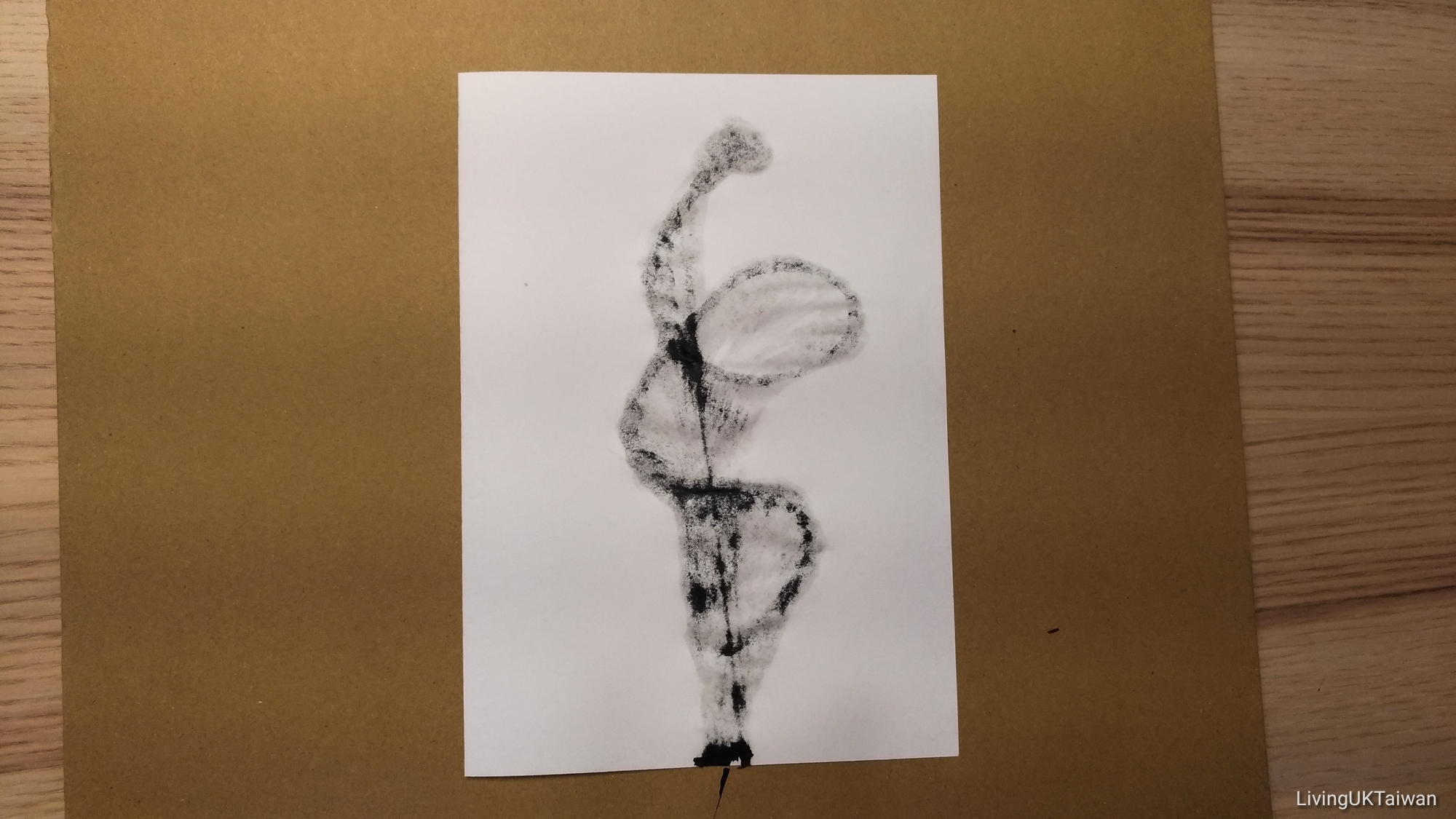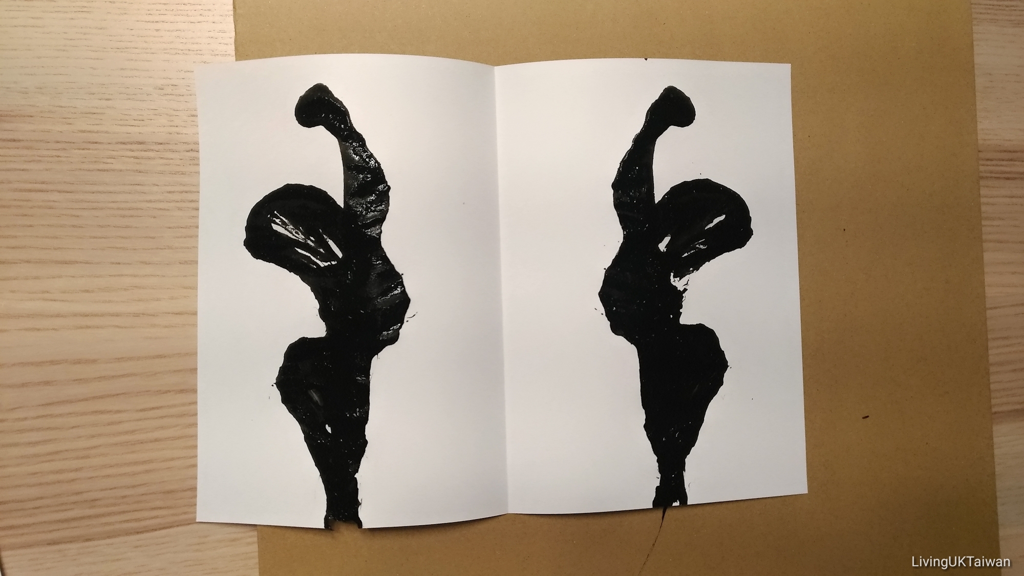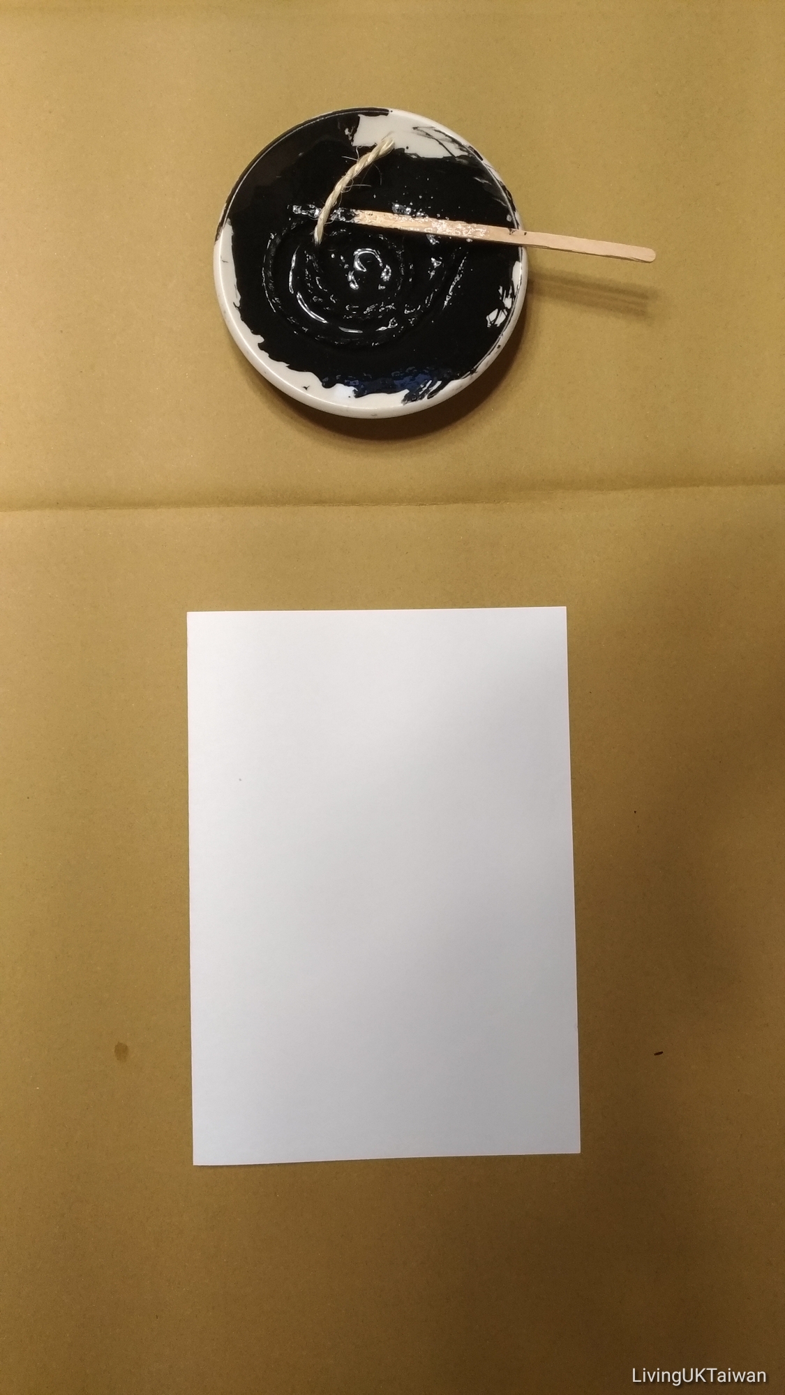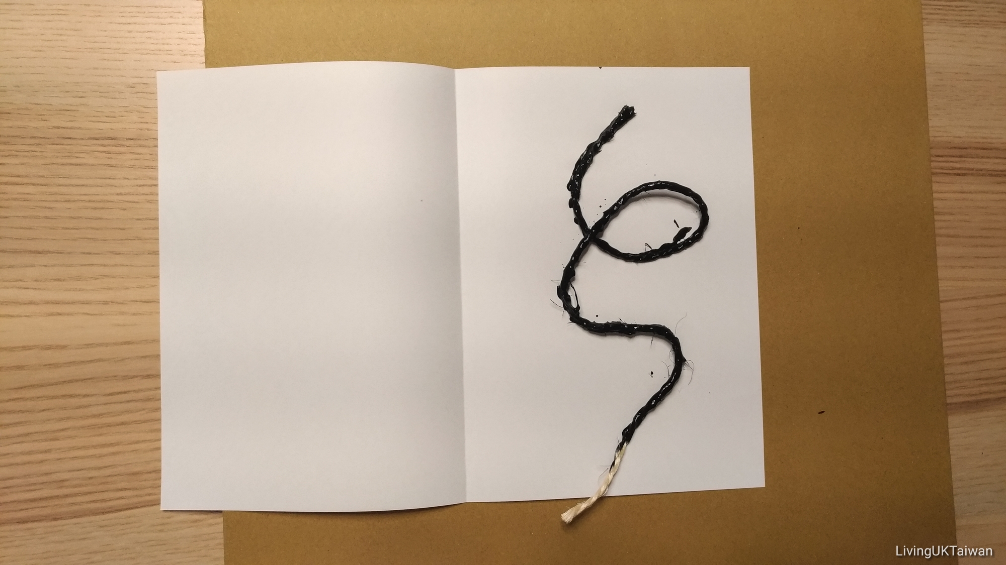 今天練完書法還有墨汁剩,就地取材試學人家玩繩子拉花。我把繩子浸在墨汁裡,然後小心翼翼鋪在白紙上。 繩子較粗,白紙又小,所以擺的線條比較拘謹。我把另一張白紙和雜誌蓋上去,用手壓著然後慢慢把繩子往下拉。很緊張,不知我的第一張作品如何呢?