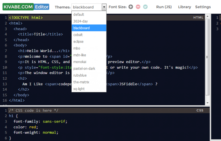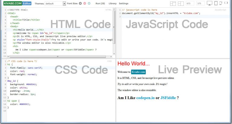 Editor Box: There are four separate boxes and the first of them is HTML code, and the CSS code at the bottom, the JavaScript code at the top right and the following is the Live Preview view option in the desktop version. And they are provided tabs for mobile phones. The following is a preview of the desktop version of the image.