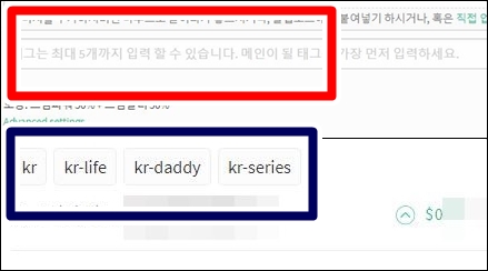 글을 쓰면서 빨강 네모 안에 띄어쓰기로 구분지어 태그를 넣고 글쓰기 버튼을 누르고 나면 파란 네모처럼 본인 글의 태그를 확인할 수 있습니다.