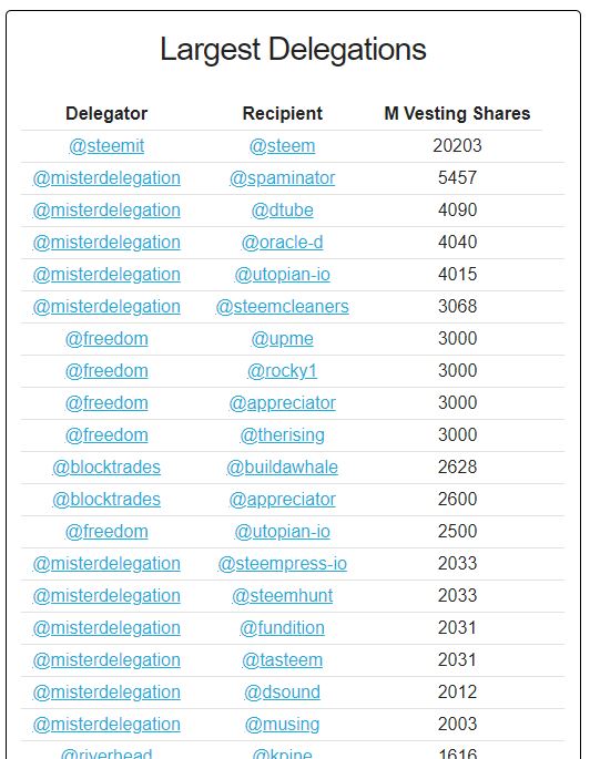 Delegation 탭에 들어가면 누가 누구에게 스팀파워를 임대해주었는지 확인할 수 있습니다. Biggest Delegations Chart를 눌러 들어간 임대상황도 재미있네요. 제가 많이 썼던 보팅봇 upme는 freedom으로부터 보팅파워를 임대받고 있네요.