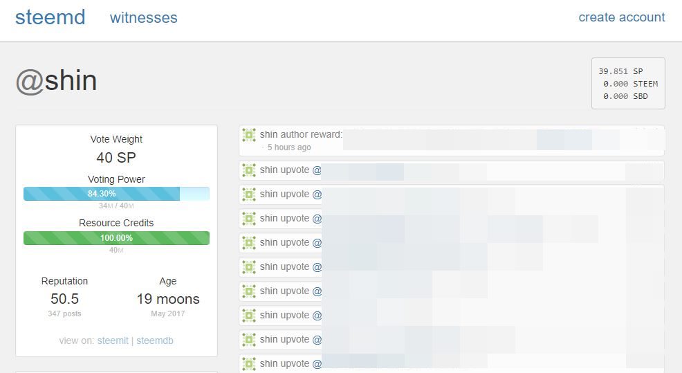 주소창에 “ https://steemd.com/@본인아이디 ”를 입력하시면 본인의 스팀파워, 보팅파워, 대역폭, RC(Resource Credits), 명성도를 확인할 수 있습니다. 저는 40SP(스팀파워)를 갖고 있습니다. 보팅해봤자 $0.01 정도밖에 올라가지 않는 피라미 중의 피라미입니다. 다른이의 글에 보팅을 하면 보팅파워가 조금씩 줄어들었다가 시간이 지나면 조금씩 차오릅니다. 지금은 보팅파워가 84.30%이 남아있네요. 100%일 때의 보팅파워를 $0.01이라고 가정한다면 이 상황에서 다른이의 글에 보팅을 하게 되면 그 글의 보상액이 $0.0084올라가겠네요. 보팅파워 바로 밑에 34M/40M은 제가 활동하면서 쓸 수 있는 데이터양을 의미합니다. 이게 일정량 이하로 내려가면 대역폭 제한 오류가 뜨면서 글을 쓸 수 없게 됩니다. 고용량사진은 리사이즈하여 작게 올릴 필요가 있겠네요. RC는 최근에 생긴 개념 같은데 보팅, 댓글달기, 글쓰기 등에 모두 쓰이는 것 같습니다. 활동할수록 줄어들었다가 활동을 멈추면 다시 충전이 되겠죠. 스팀코인을 사서 본인계정에 충전을 시키면 SP와 대역폭제한, RC의 최대치가 높아지면서 활동의 제약을 덜 받게 됩니다. 제 평판(명성도)은 50.5입니다. 명성도 높은 사람의 보팅을 받게 되면 점점 올라갑니다.