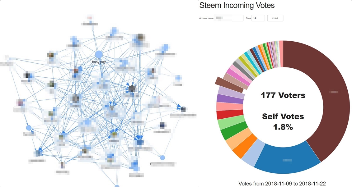 누가 누구와 보팅을 주고 받았는지 확인할 수 있는 사이트입니다. Account Voting을 눌러 들어간 뒤에 Outgoing Votes, Incoming Votes, Votes Graph 등을 클릭하여 나온 화면에 본인의 아이디를 입력하면 내가 주로 누구에게 보팅을 했고 누구로부터 보팅을 받았는지를 도넛 그래프로 확인할 수 있습니다.