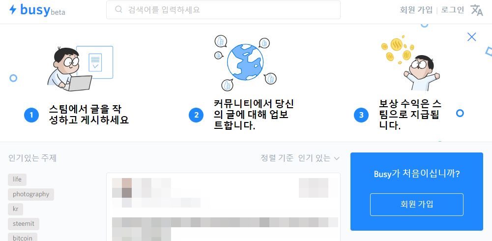 비지는 일종의 스팀 호환 사이트로서 비지 사이트에서 글을 쓰면 스팀잇에도 동일한 글이 올라갑니다. 글쓰기 UI가 스팀잇보다 조금 나은 편이며 여기서 글을 쓰고 첫 번째 태그에 busy를 넣으시면 busy 서비스에서 보팅을 해 줍니다. 별도 가입이 필요없고 스팀잇의 아이디와 비밀번호를 그대로 이용합니다.
