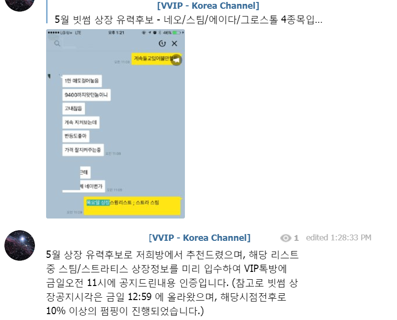 암호화폐 거래소 빗썸 직원이 신규 상장하는 암호화폐에 대한 정보를 상장 전 유출시켰다는 의혹이 나왔습니다. 빗썸 측은 진위여부를 확인중이며 유출자가 있다면 엄정대응하겠다는 방침이라고 합니다. 빗썸 직원으로 추정되는 인물이 이더리움을 받고 정보를 전달하는 유료 정보 서비스를 통해 ‘스트라티스’와 ‘스팀’이 빗썸에서 새로 거래를 시작한다는 내용을 빗썸의 공지시간인 24일 오후1시보다 빠른 오전 11시쯤 유출하는 내용의 카카오톡 대화 내용 캡처화면이 등장했습니다.