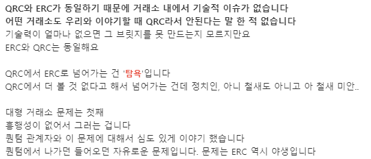 사심이 들어간 소식으로 다양한 프로그래밍 언어를 지원하는 X86 VM이 개발되었음에도 크게 호재가 반영되지 않는 퀀텀 소식입니다. 퀀텀 기반(QRC)의 dApp들이 최근 이더리움 기반(ERC)으로 넘어간다는 공지가 차례대로 발표되면서 고전을 면치못하고 있는데 어제 X86 VM 런칭을 기념하여 밋업을 개최했다고 합니다. 퀀텀 커뮤니티에서 다녀오신 분의 글을 보니 QnA 시간이 없어서 아쉬웠다고 하더라구요. 계란 투척하기 위해 밋업 참가한다는 투자자분도 계셨었는데 차마 던지지는 못했다고 합니다. ^^
