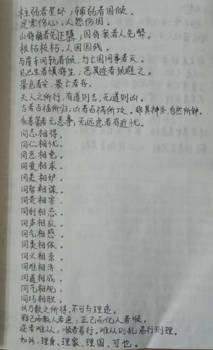 不知道是因为它的文辞,还是因为它的道理沁人心脾,让人心气平静。我越抄写,字越来越整齐。不自觉的越来越要求自己书写规整,一种意识是:不写规整对不起这些文字,可以慢,没关系,不用着急。