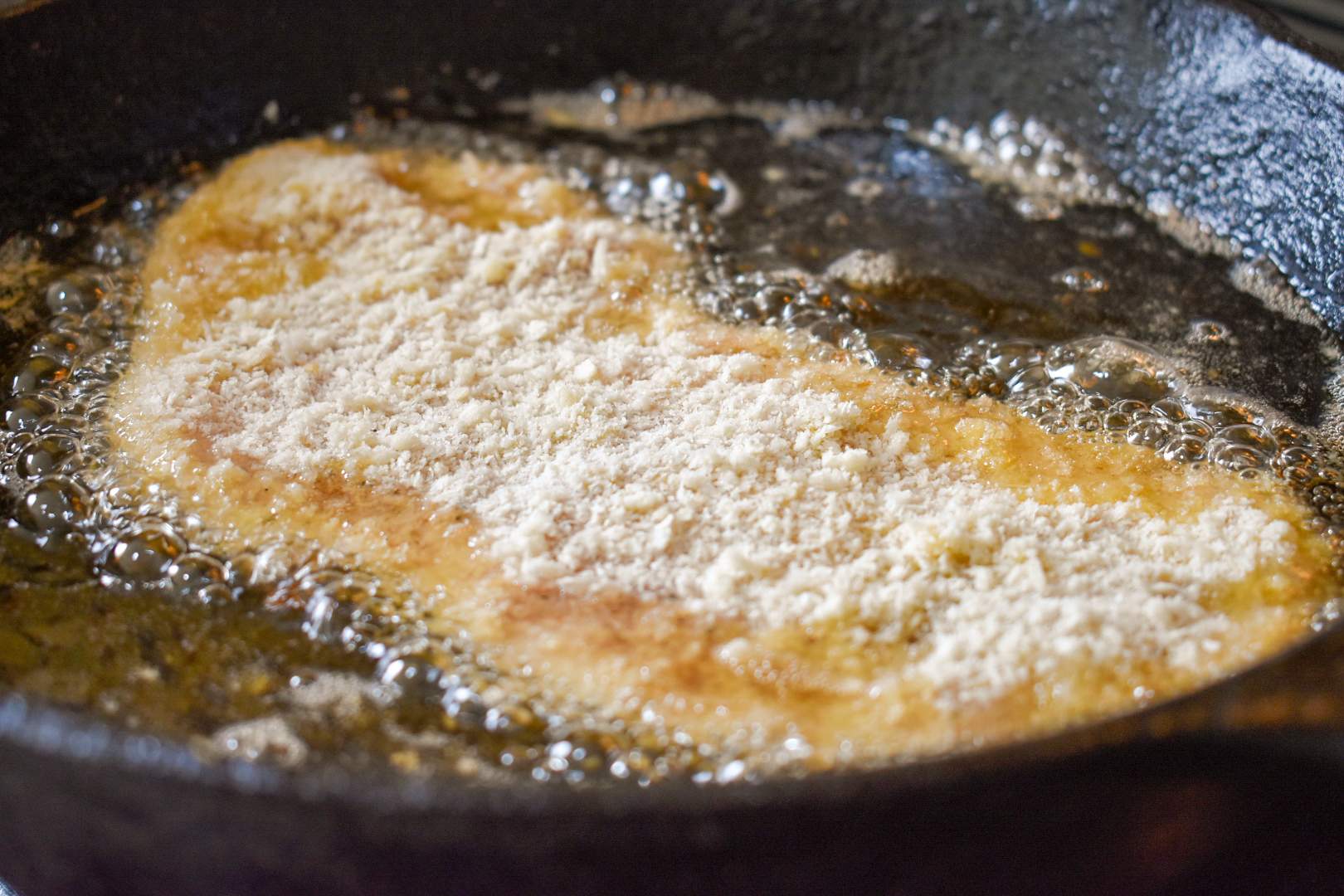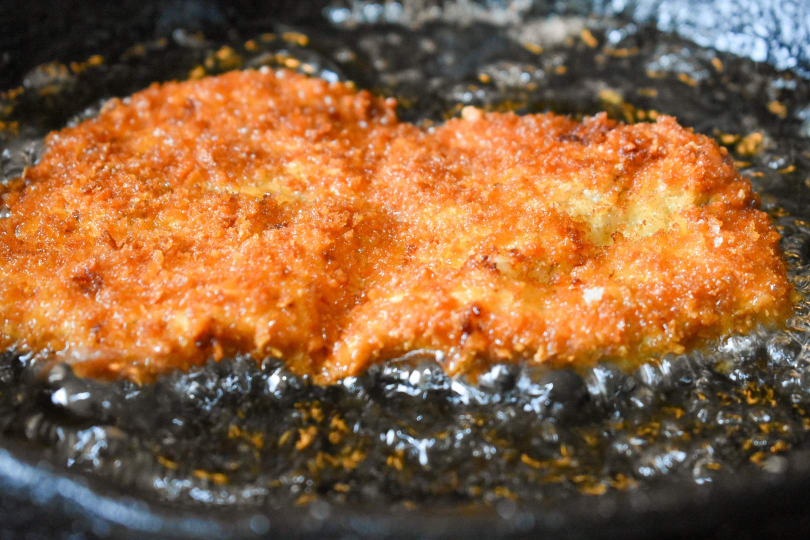 The traditional Schitnzel uses panko breadcrumbs. Panko breadcrumbs give it more a crunchy texture than regular breadcrumbs since it doesn't absorb as much oil.