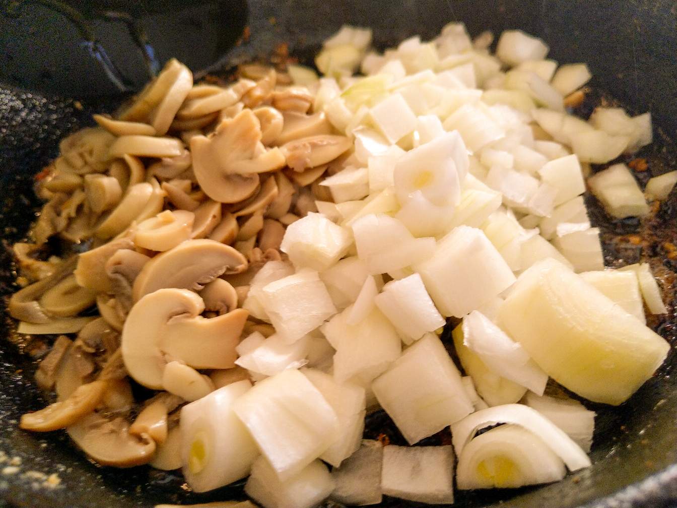 - Turn the heat on low and add the diced onion, cook until translucent. Add the mushrooms and cook for 8 minutes or more until the water evaporated on the mushrooms. Then add the wine and stir well.