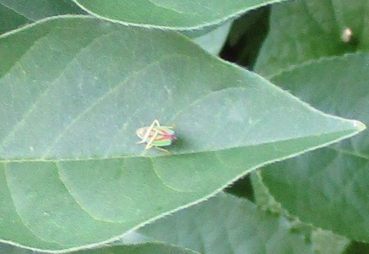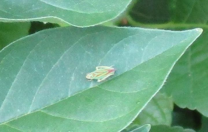 These photos aren't very good because this leafhopper was far away and so small; 3/8 of an inch long. And they hop, leap and fly away so fast. A member of the Cicadellidae family and native to North America, these colorful insects can do a significant amount of damage to the leaves of blackberry and raspberry bushes, and ornamental plants. Their piercing mouth parts suck the juices from the leaves.