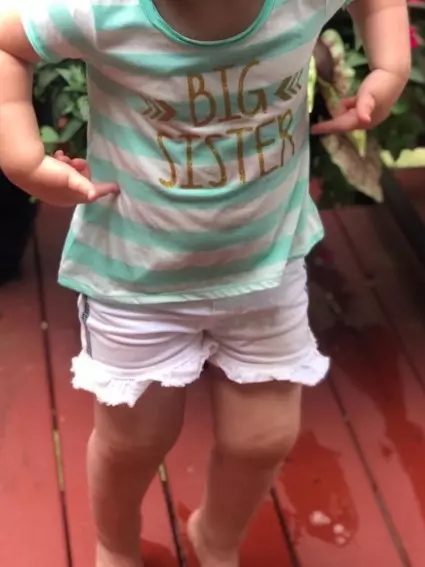 The shirt is soft and so cute. Such a great shirt for a pregnancy announcement. We had our three-year-old wear it to the grandparents house. She is consistently in 4T shirts but we bought a 5T hoping she can grow into it a little and wear this for awhile. I’d say this is true to size compared to other brands I typically buy, like Cat & Jack at Target.