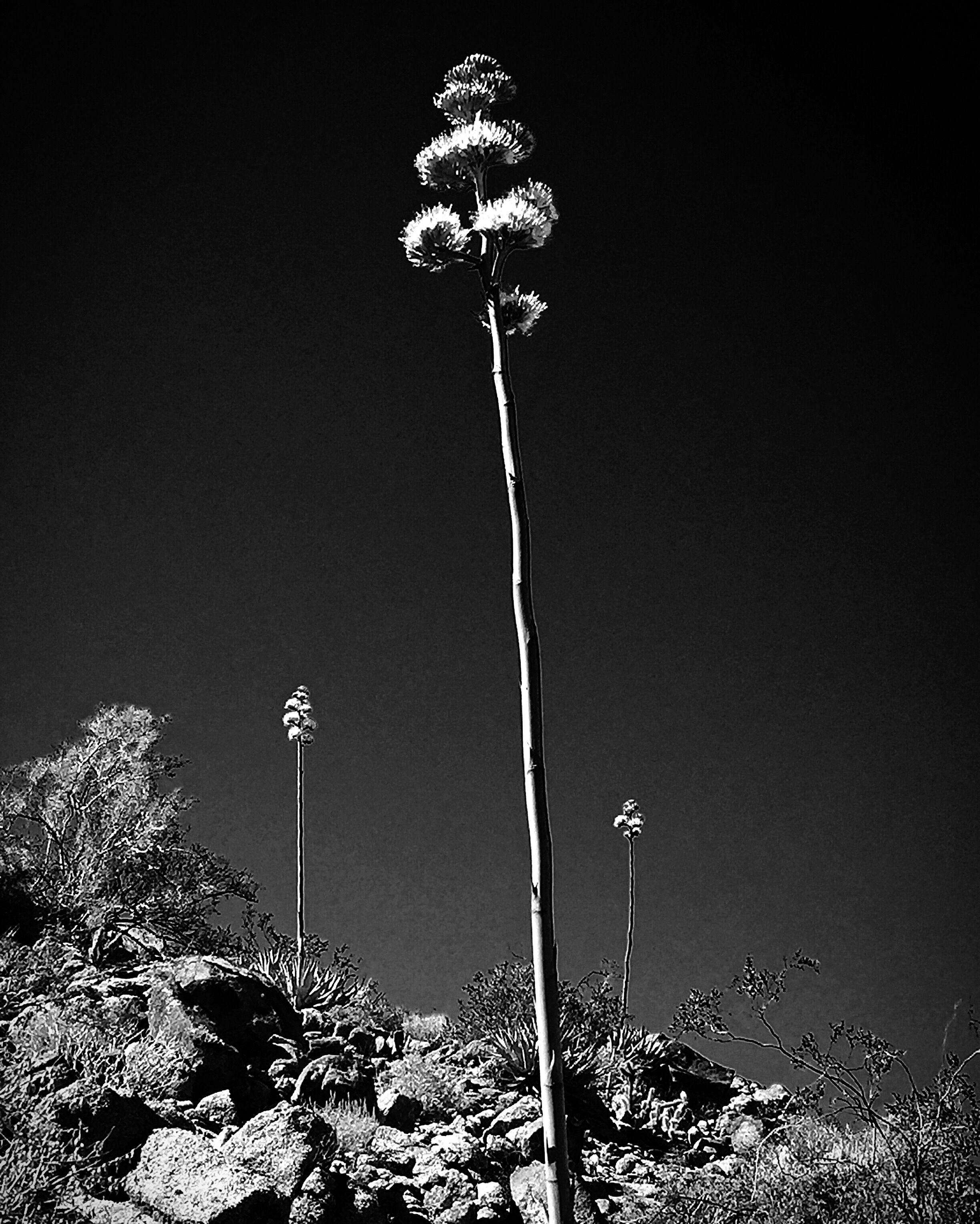 On a hike on the Earl Henderson trail just outside Palm Springs, California, I came across this stand of blooming Yuccas. I was surprised how tall the blooms rose above the plant. This is my entry to @daveks’ B&W Photo Contest for the landscape theme.