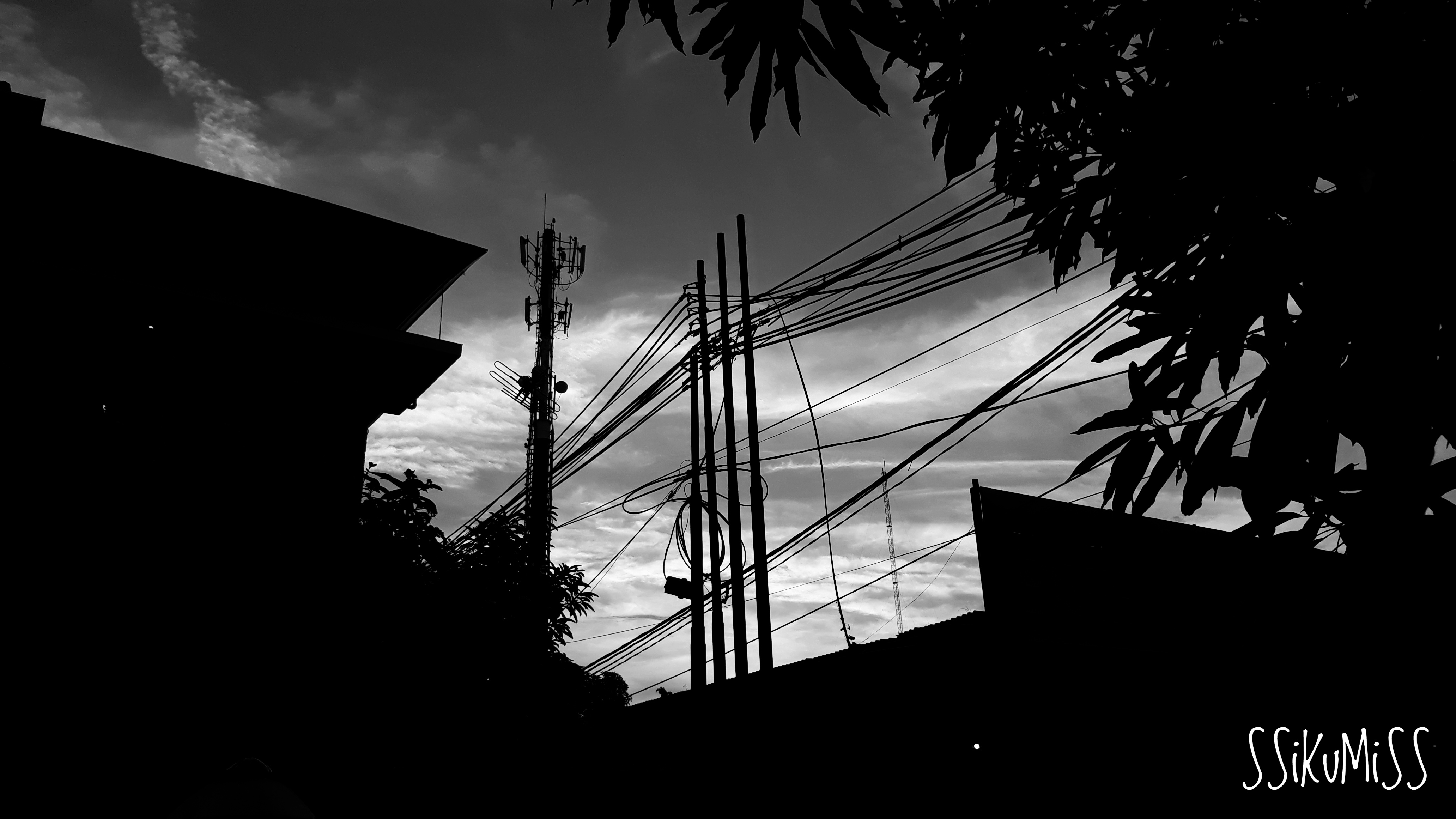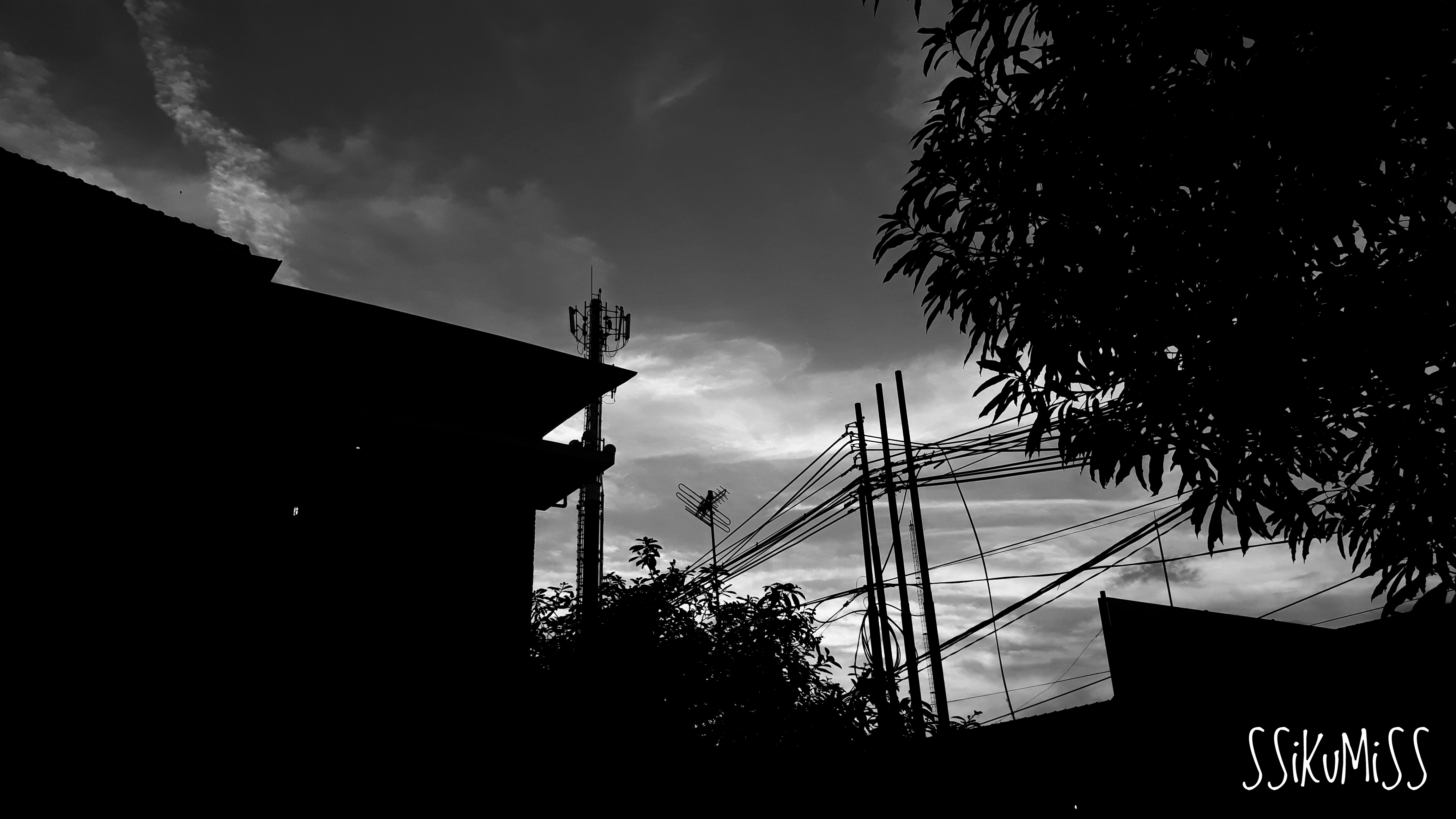 Sore hari di kantor saya memotret siluet yang lumayan menarik. Ketika sedang menelepon seorang relasi saya tak sengaja melihat ke balik pohon dan menemukan momen yang menarik ini. Setelah saya selesai berdiskusi dengan relasi di telepon saya segera mengambil Smartphone untuk memotret momen yang aduhai ini. Secara warna siluet ini bagus khas warna senja. Tapi saya lebih tertarik untuk menjadikannya hitam putih.