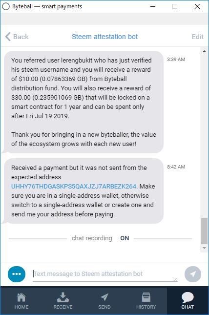 Perhatian: Jika kita memiliki lebih dari satu akun Steemit, kita perlu menggunakan perangkat yang berbeda untuk mendaftar Byteball, atau kita tidak akan mendapatkan hadiah untuk akun yang lainnya.