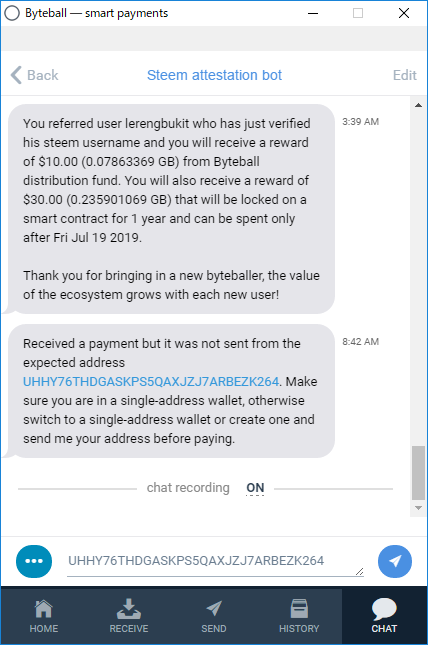 - Jangan copy paste alamat Byteball di Steemit, karena pencuri akan beraksi.