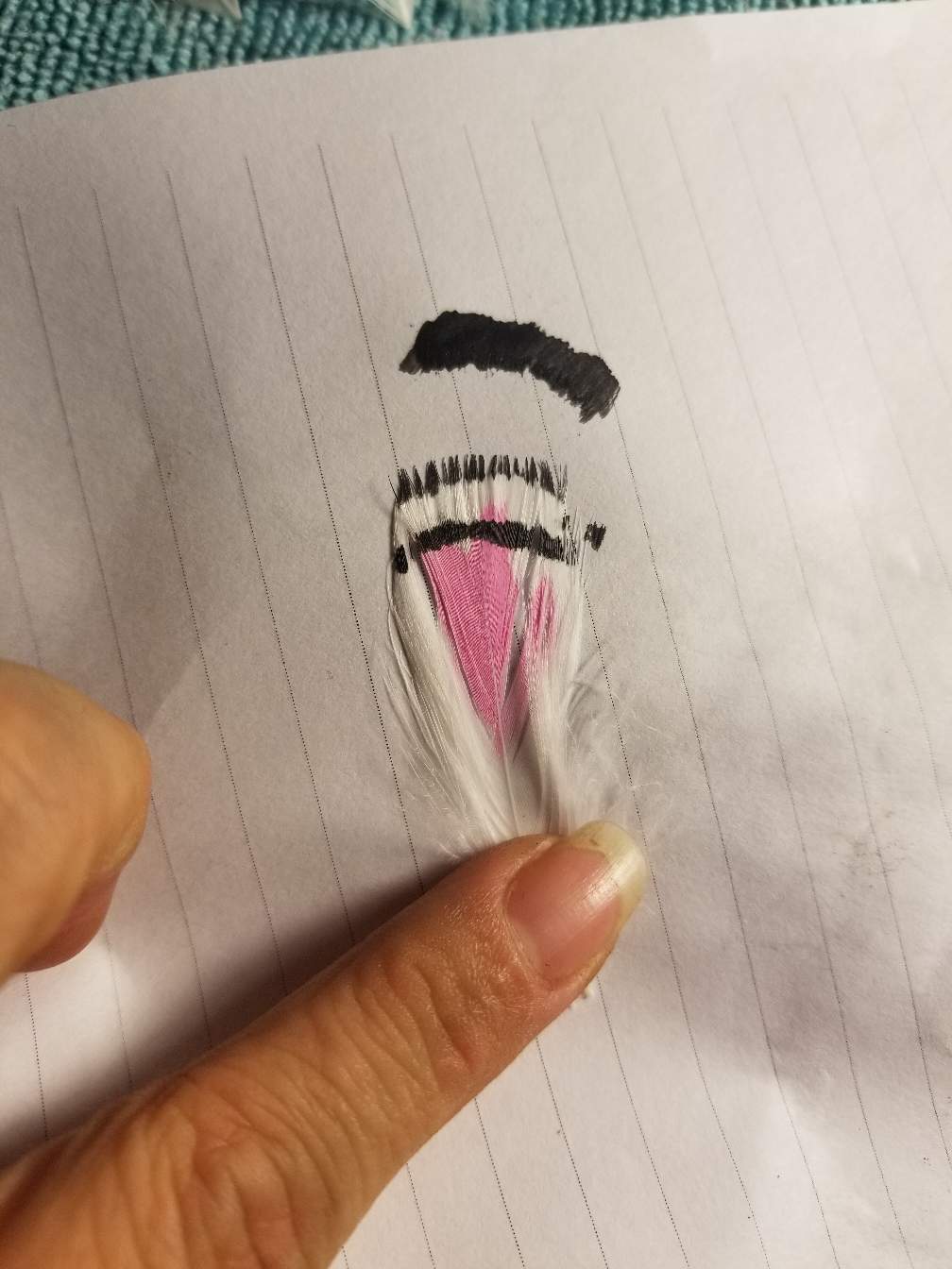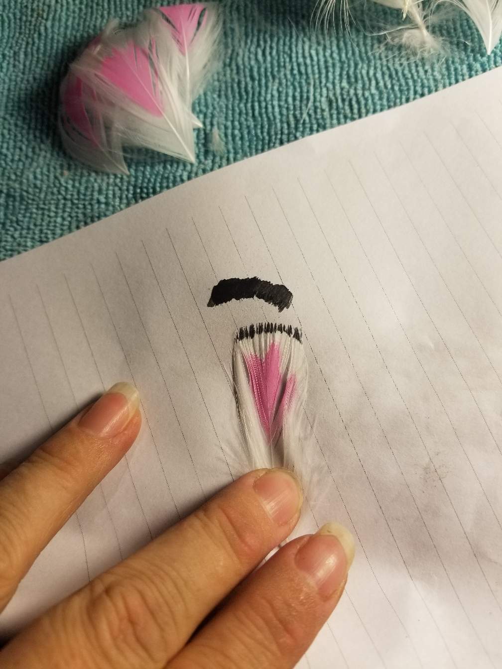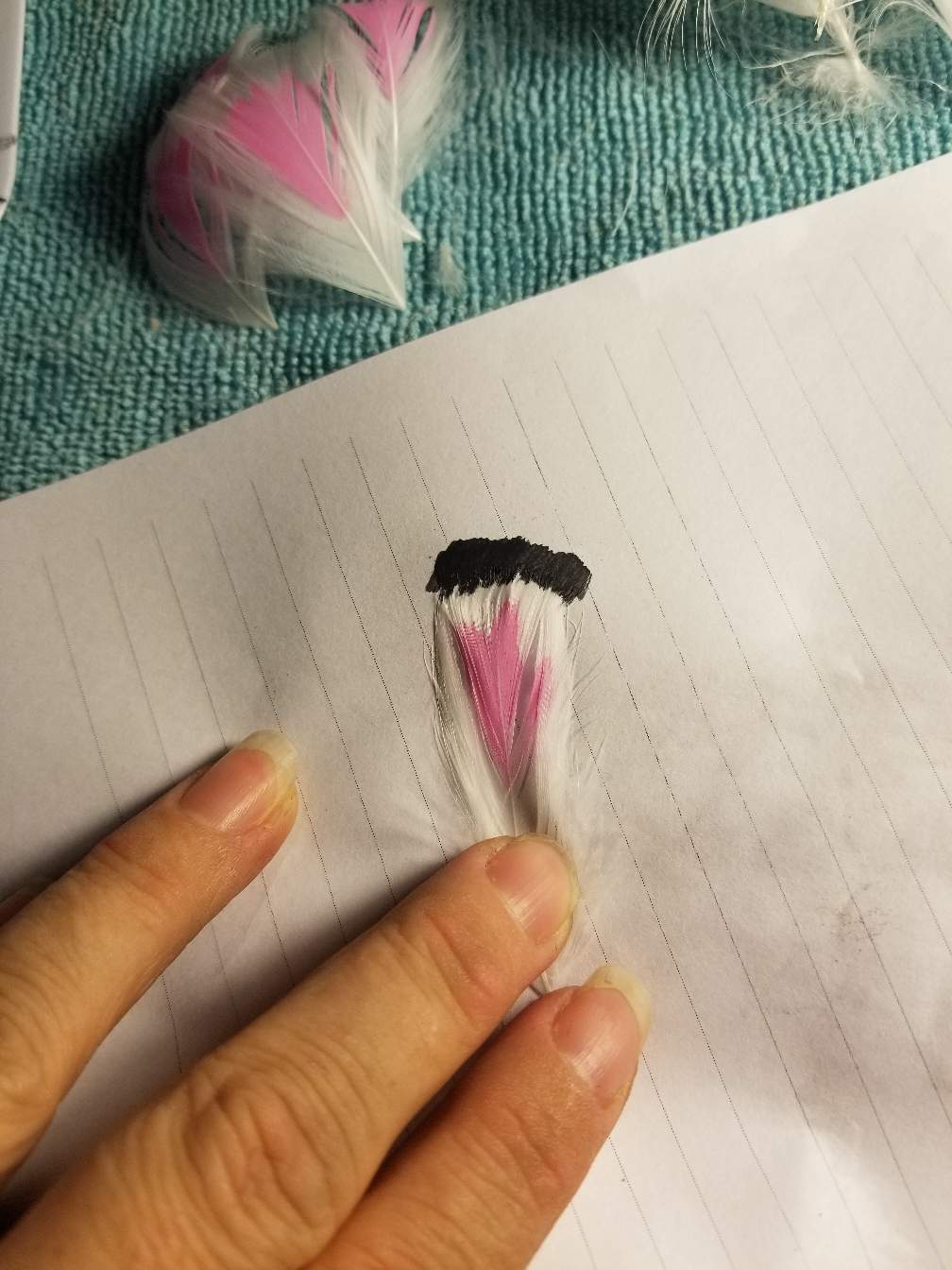 If you did it nice and thin it will dry pretty fast so you can work on the next color. That's adding the two black bands. I brush the tip of the feather first.