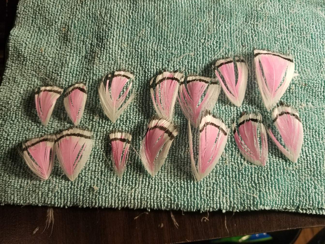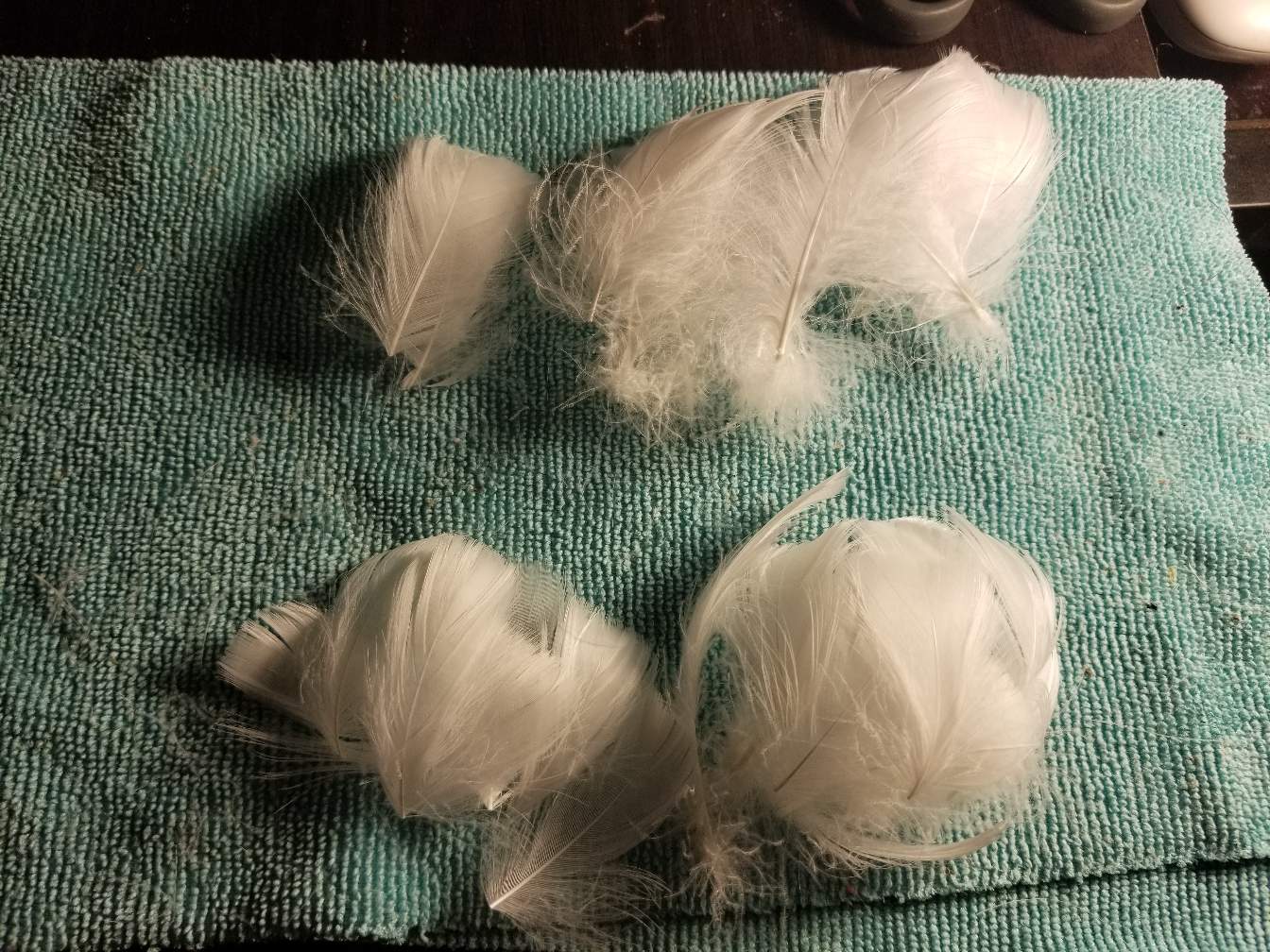 Now set the base aside. Were going to start with the feathers. I use white natural goose . And pull about 8 large feathers and 6 smaller ones .