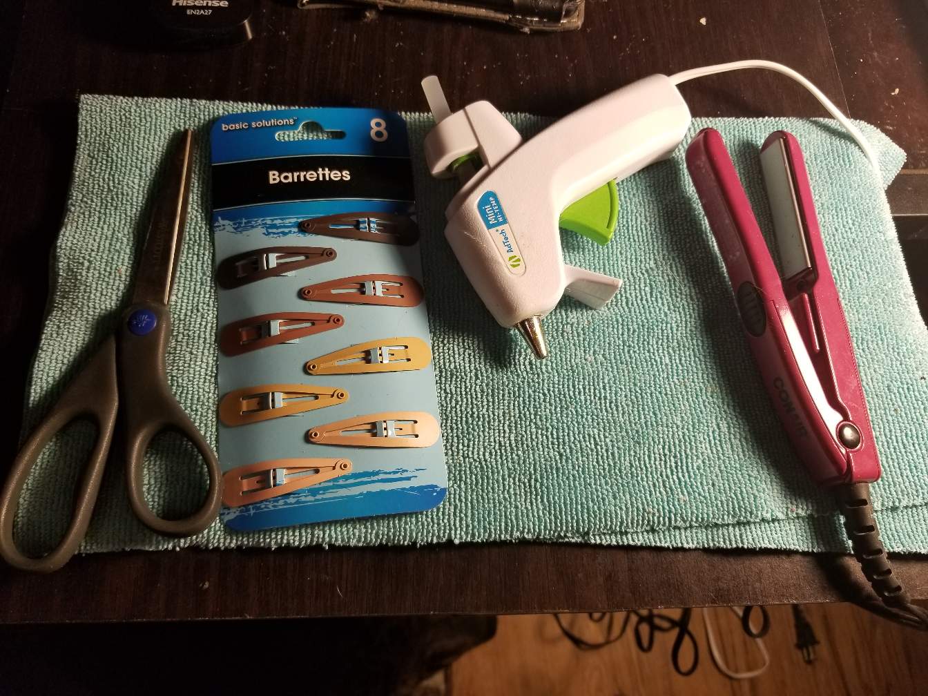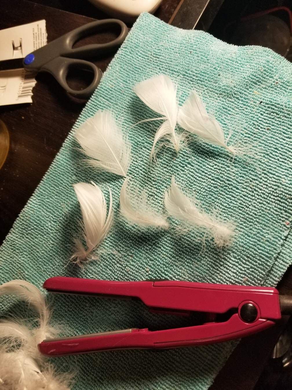 Hot glue gun, I use a mini hair flat iron, scissors, barrette hair clips ( you can use what ever kind you want I just had these around. You can even use a Bobby pin if you like) also take note of the microfiber cloth I use. It gets most of the feather fluff from going all over.