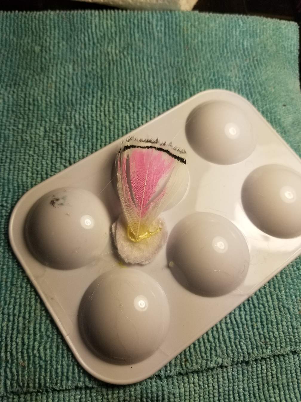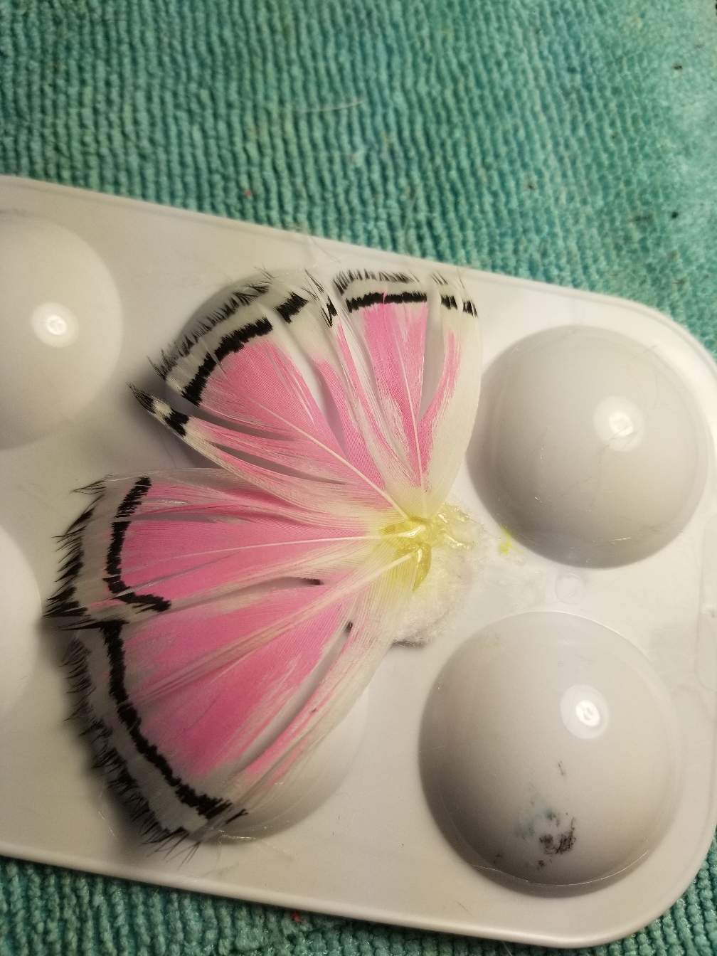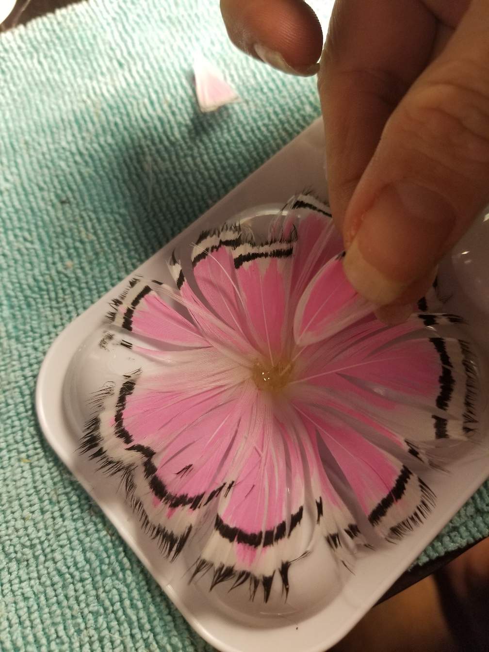 I use a extra paint pallet to keep the feathers from falling flat. Then start to add the center ring of feathers between the spaces of the first layer.