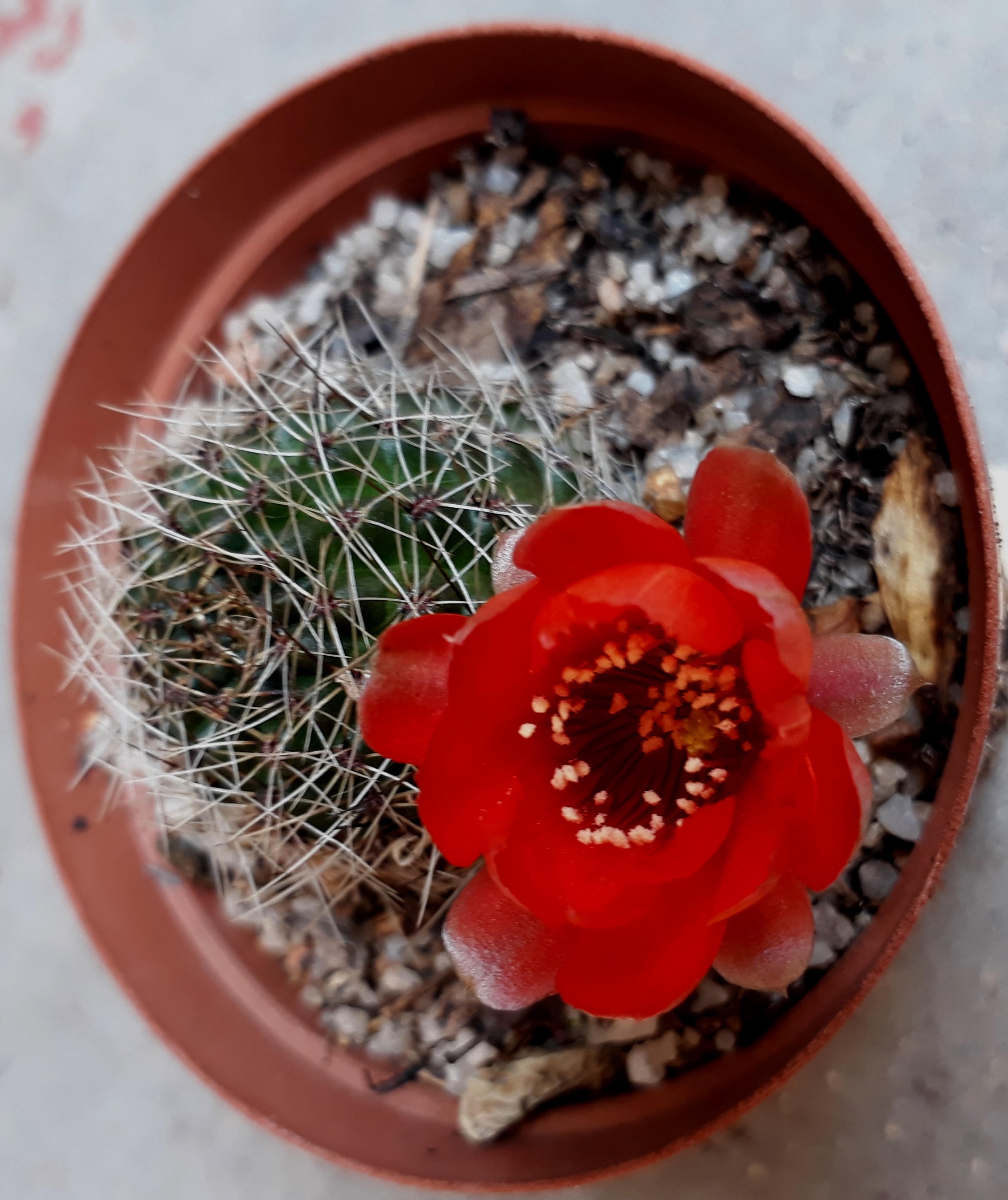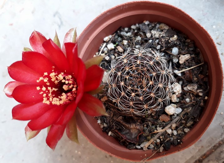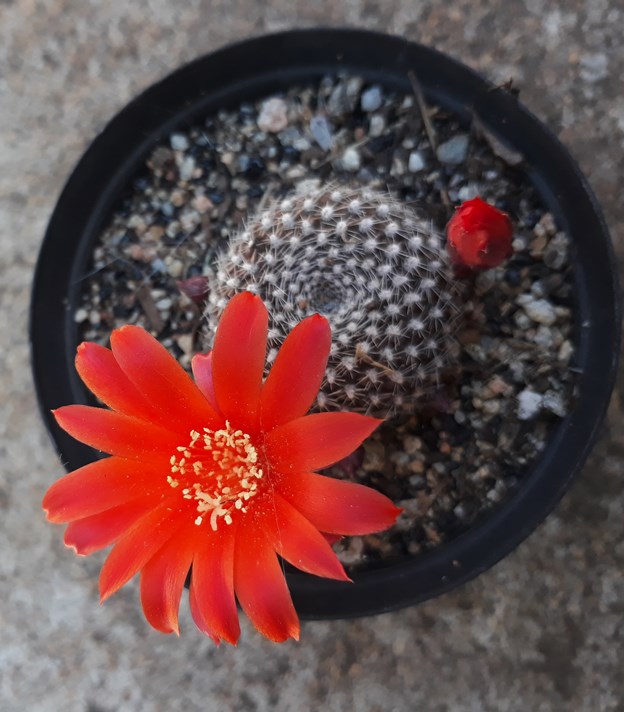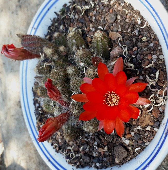 Red flowers are usually pollinated by birds as red is most attractive to the avian eye. There are no hummingbirds where I live and I notice that these cacti don't set seed, probably because there are no suitable pollinators Most of these are Rebutia family. The bottom one is a Peanut cactus