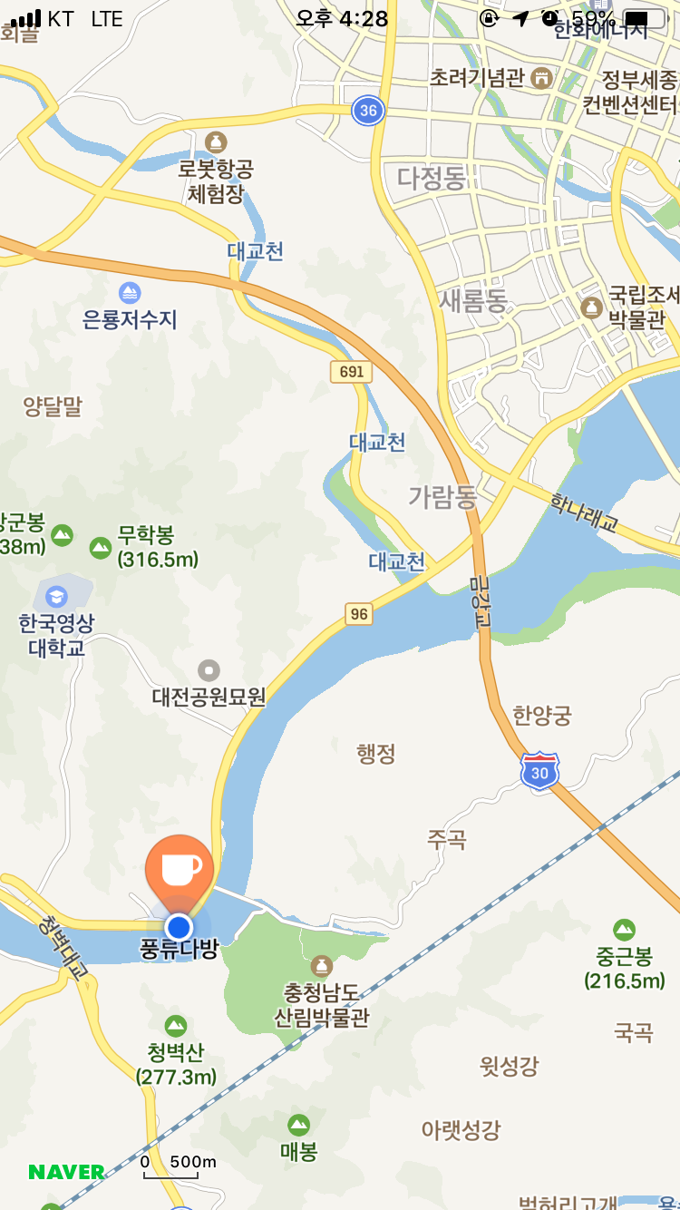 세종시 이마트 앞길따라서 공주시로 나아가다보면 반드시 보게되는 까페. 평소에 오다가다 항상 궁금해하다가 기회가 되서 한번 들어가봤는데, 경치도 매우좋고 차나 커피맛도 괜찮아서 맘에 든 곳. 하지만 워낙 까페가 작아서 주말에는 항상 사람이 북적거려서 되돌아 나온적도 몇번인가 있다.연락처 : 1877-1676