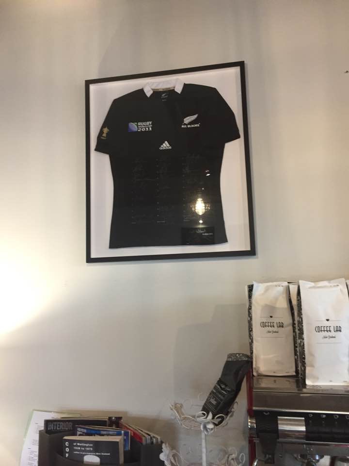 올블랙 유니폼이 걸려져 있고 선수들 사인들이 보임.