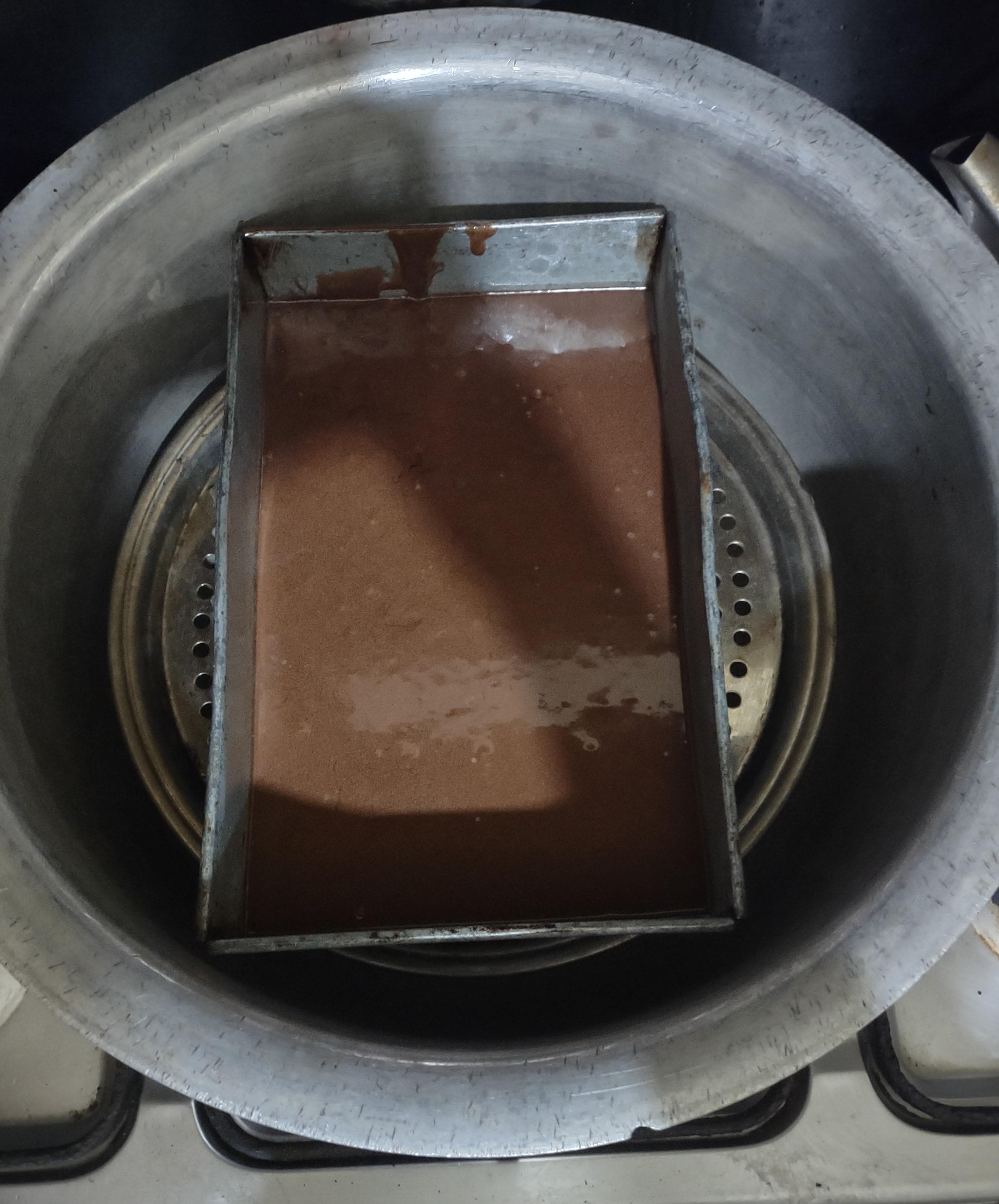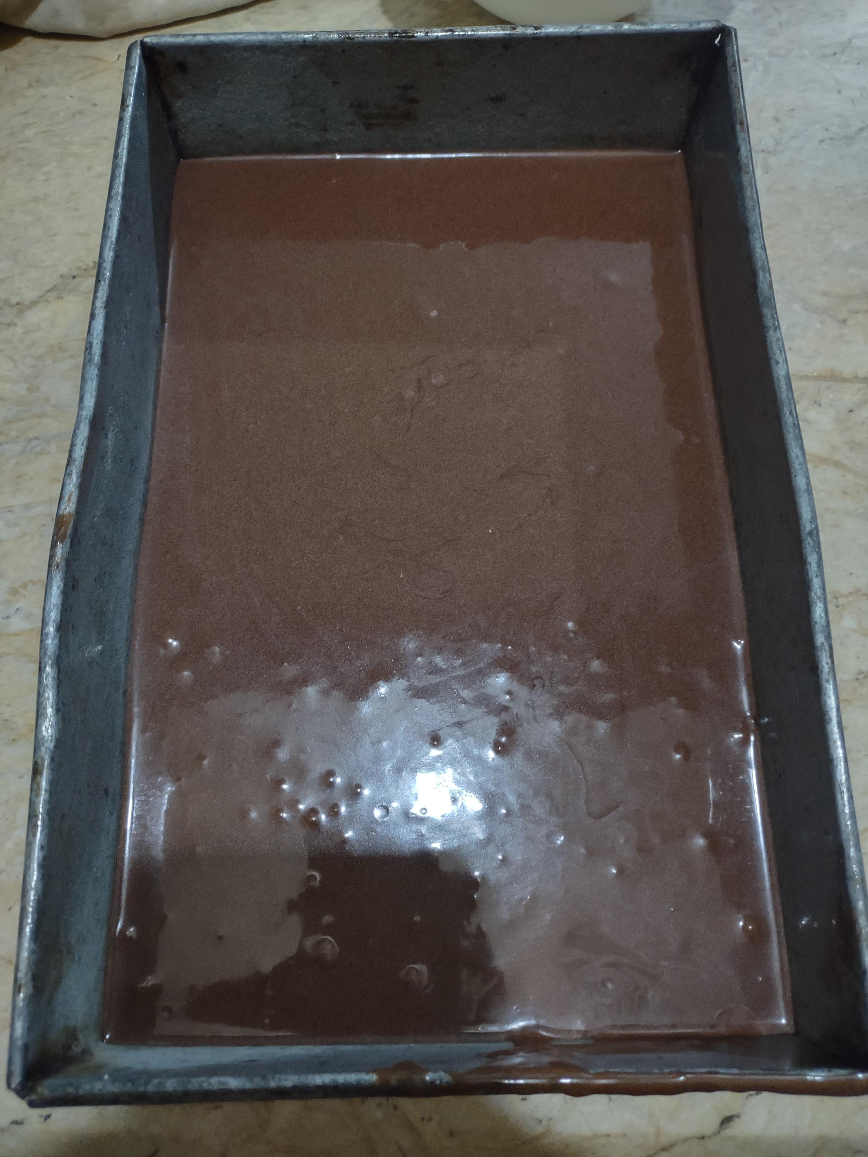 I did not have butter paper, so I just oiled my mould and spread some flour over it. This is my trick, and I use it every time, and luckily, my cake never gets stuck at the bottom of the mold. After preparing the mold, I transferred my cake mixture into it.